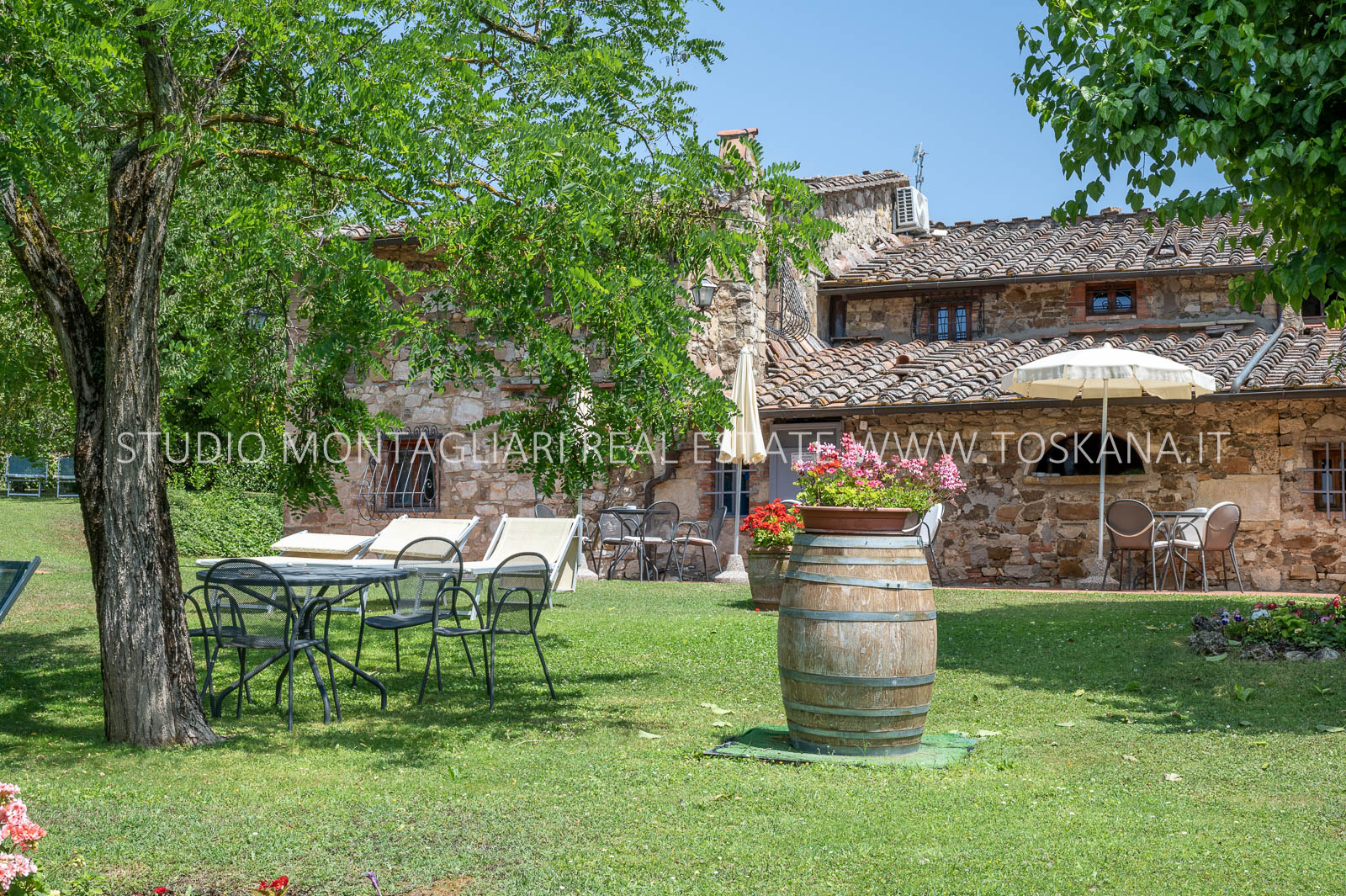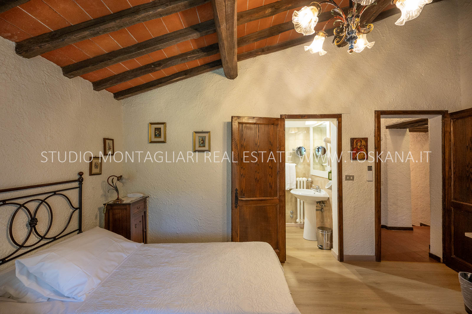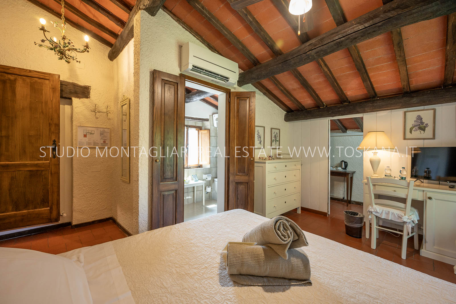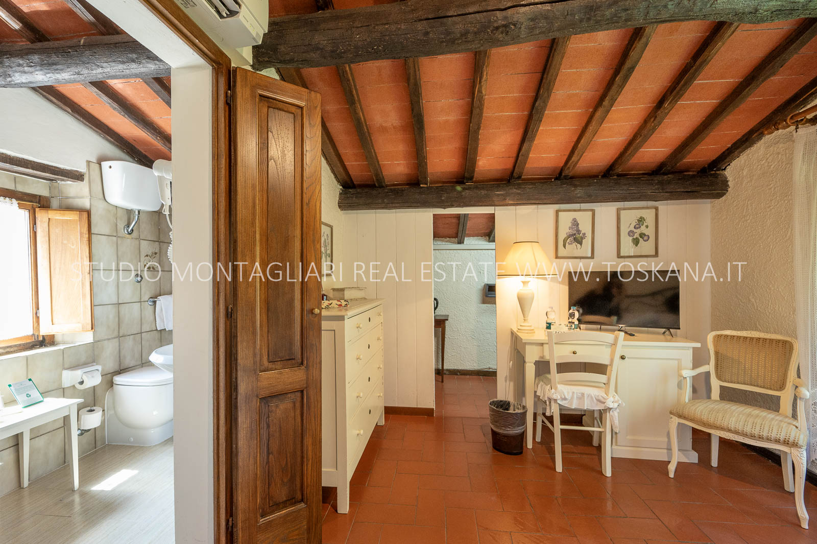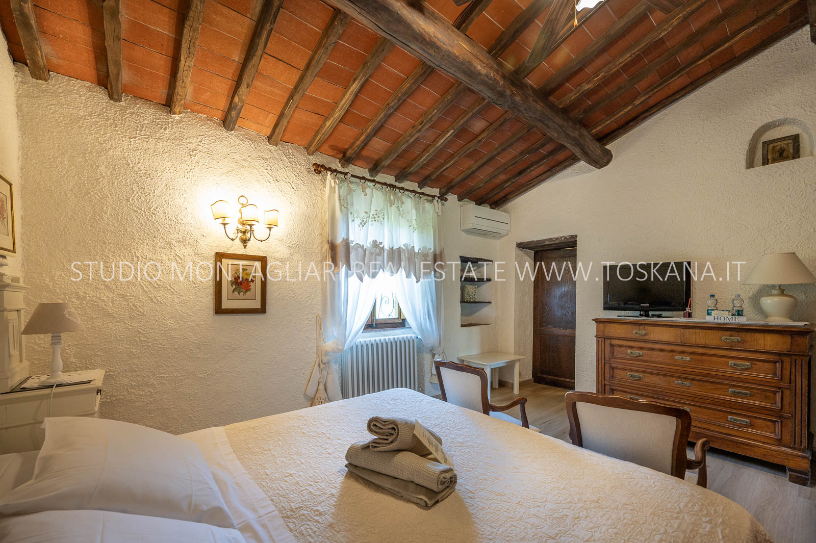 La proprietà è composta da una casa principale risalente al 1400, un fienile separato e una porzione di un edificio di costruzione recente. Immersa in un giardino curato con piscina, la proprietà offre 19 camere da letto con bagno privato, una sala ricevimenti e una sala colazioni. Tutte le camere mantengono l'originale carattere toscano, con pavimenti in cotto e soffitti con travi in legno, e sono dotate di aria condizionata.