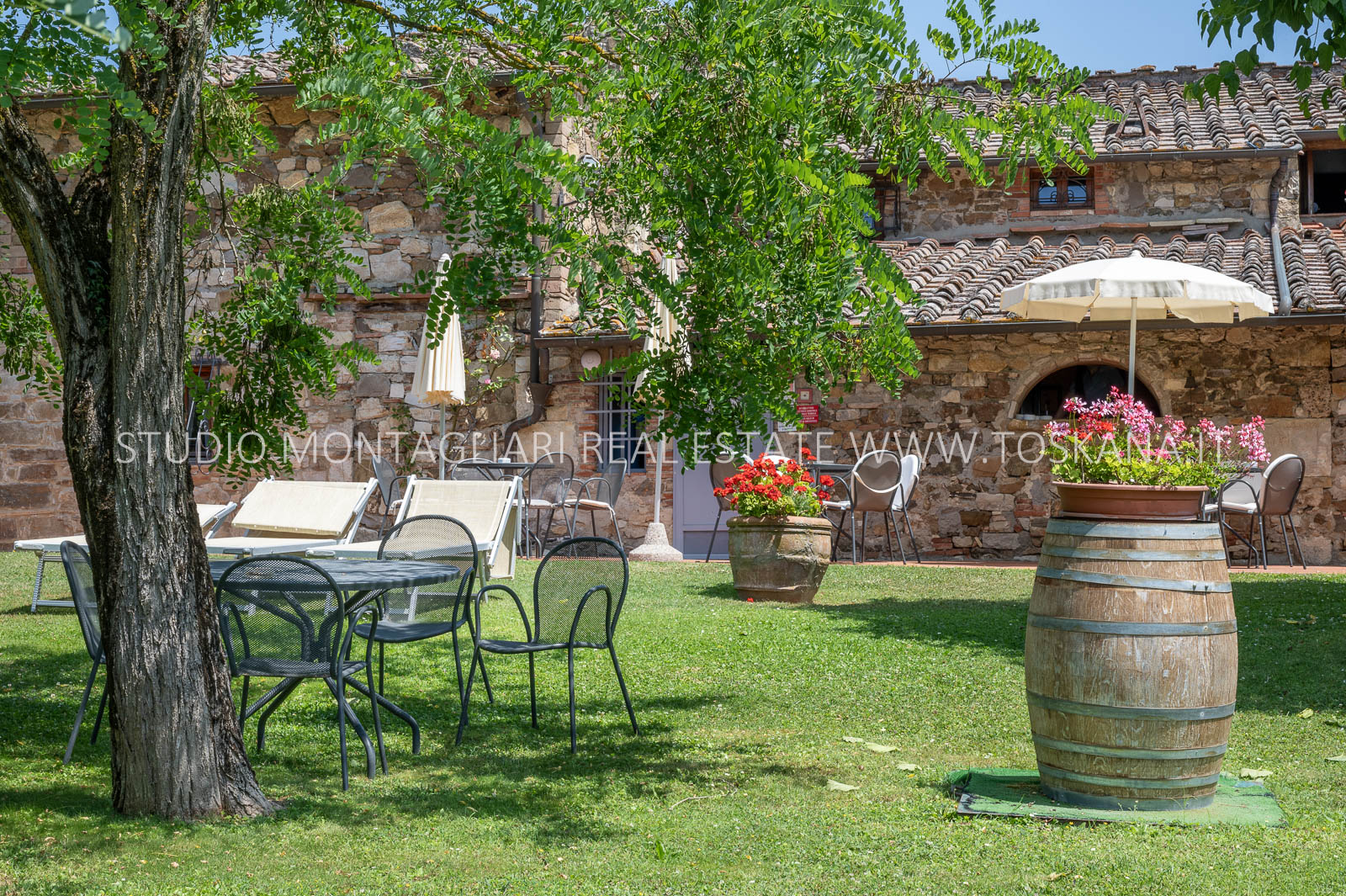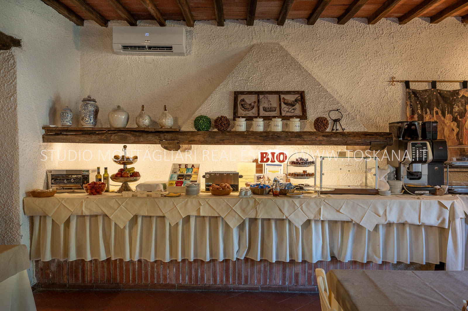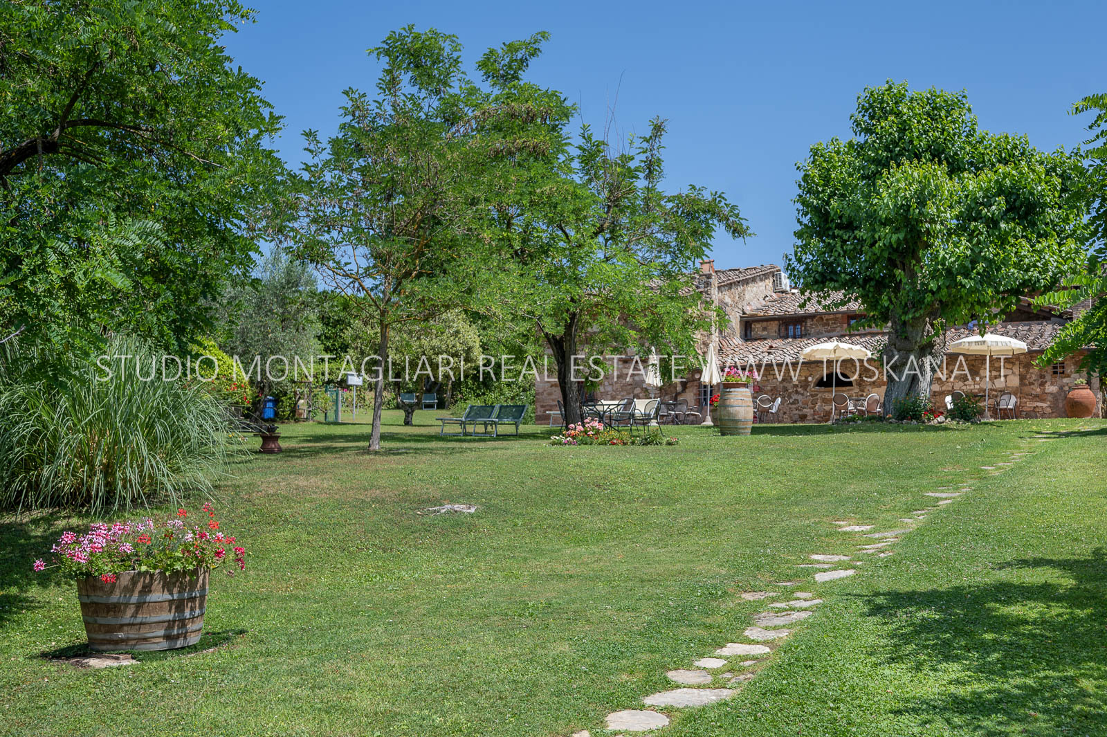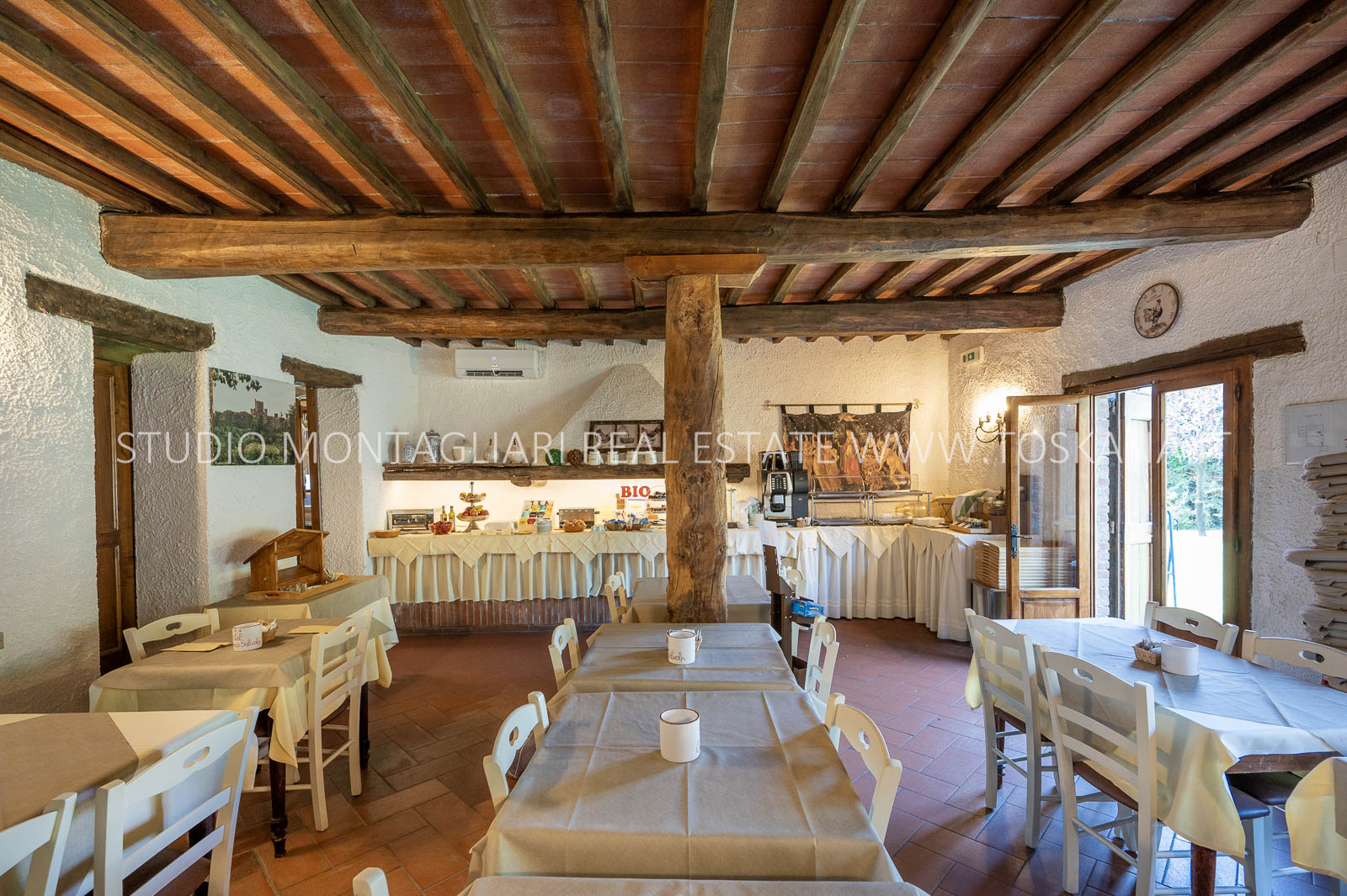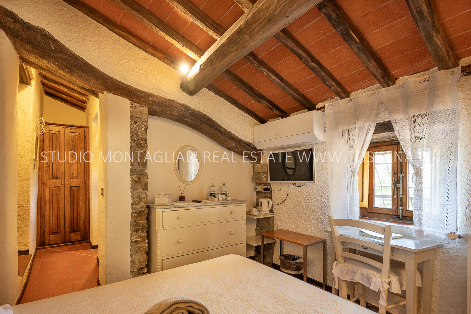 La proprietà è composta da una casa principale risalente al 1400, un fienile separato e una porzione di un edificio di costruzione recente. Immersa in un giardino curato con piscina, la proprietà offre 19 camere da letto con bagno privato, una sala ricevimenti e una sala colazioni. Tutte le camere mantengono l'originale carattere toscano, con pavimenti in cotto e soffitti con travi in legno, e sono dotate di aria condizionata.