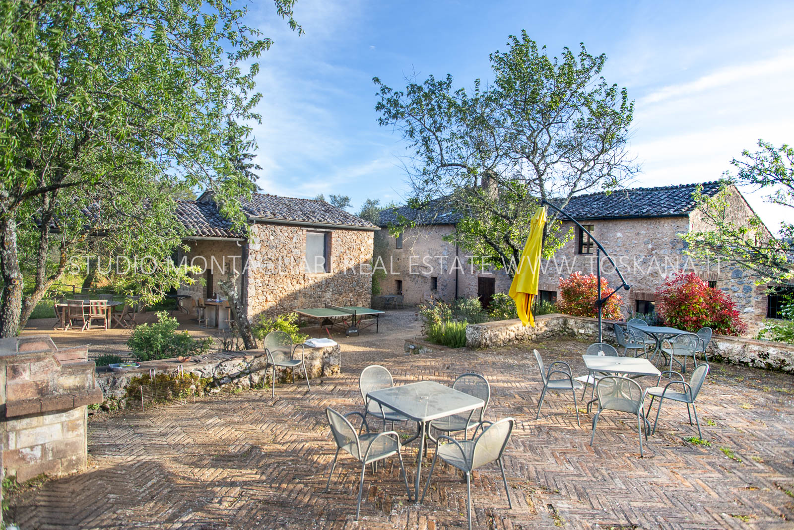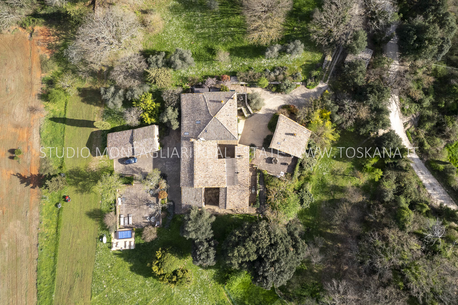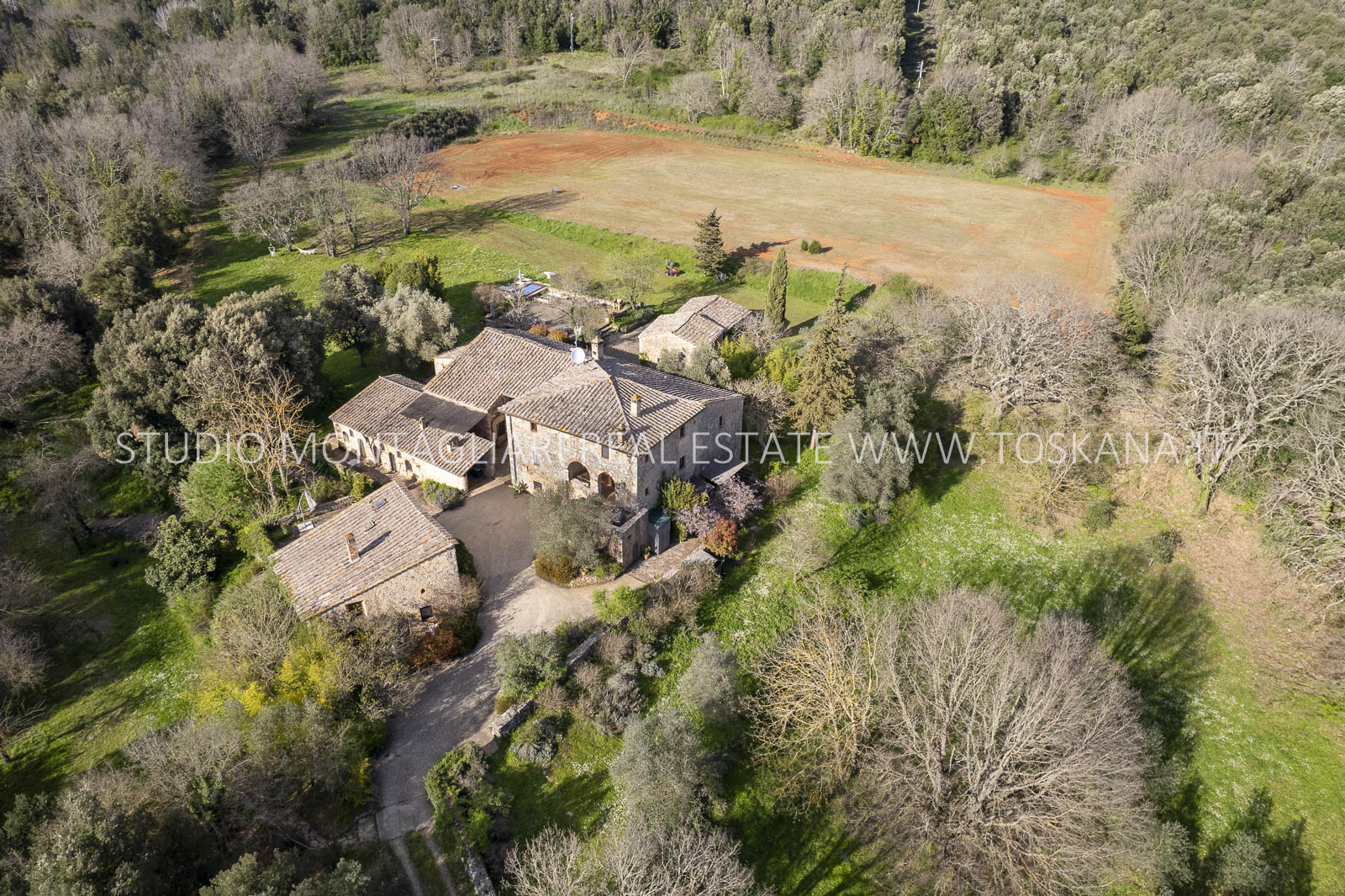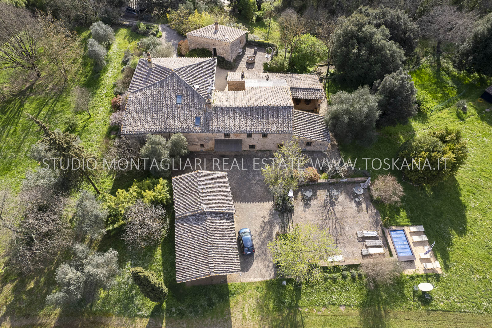 Completano la proprietà i 44 ettari di terreno circostanti con giardino, una piscina fuori terra, un ampio parcheggio, seminativo e bosco. Questa primavera è prevista la costruzione di una piscina interrata.