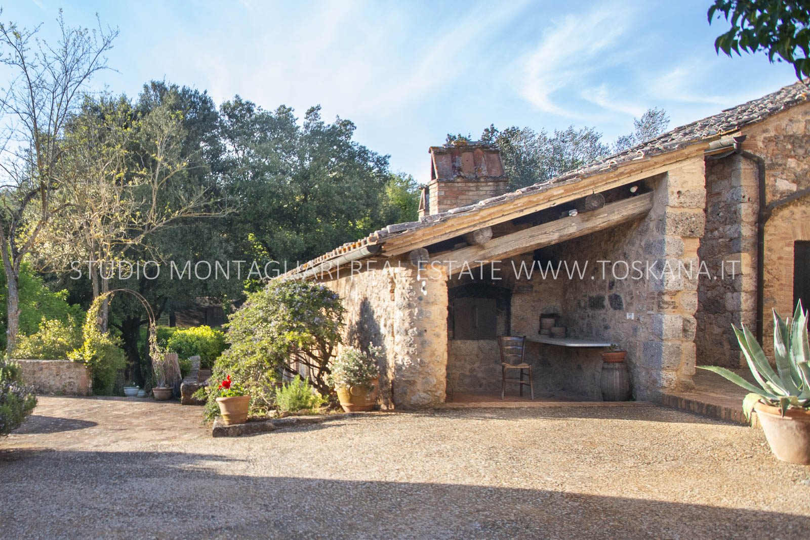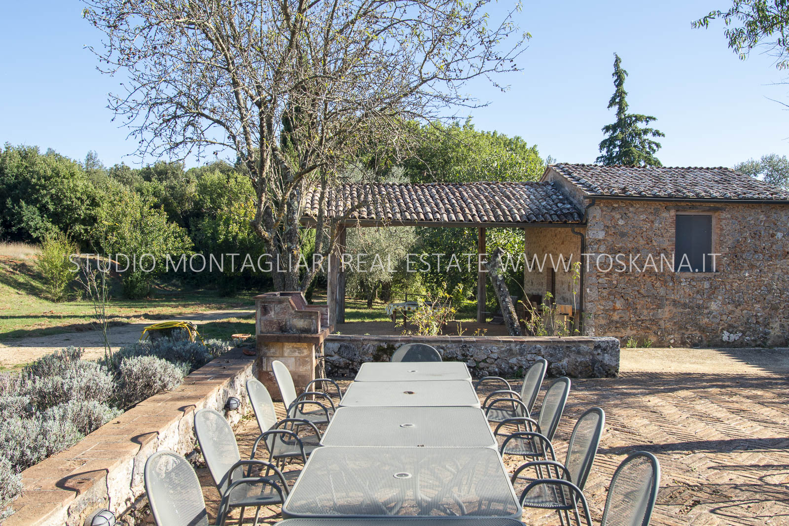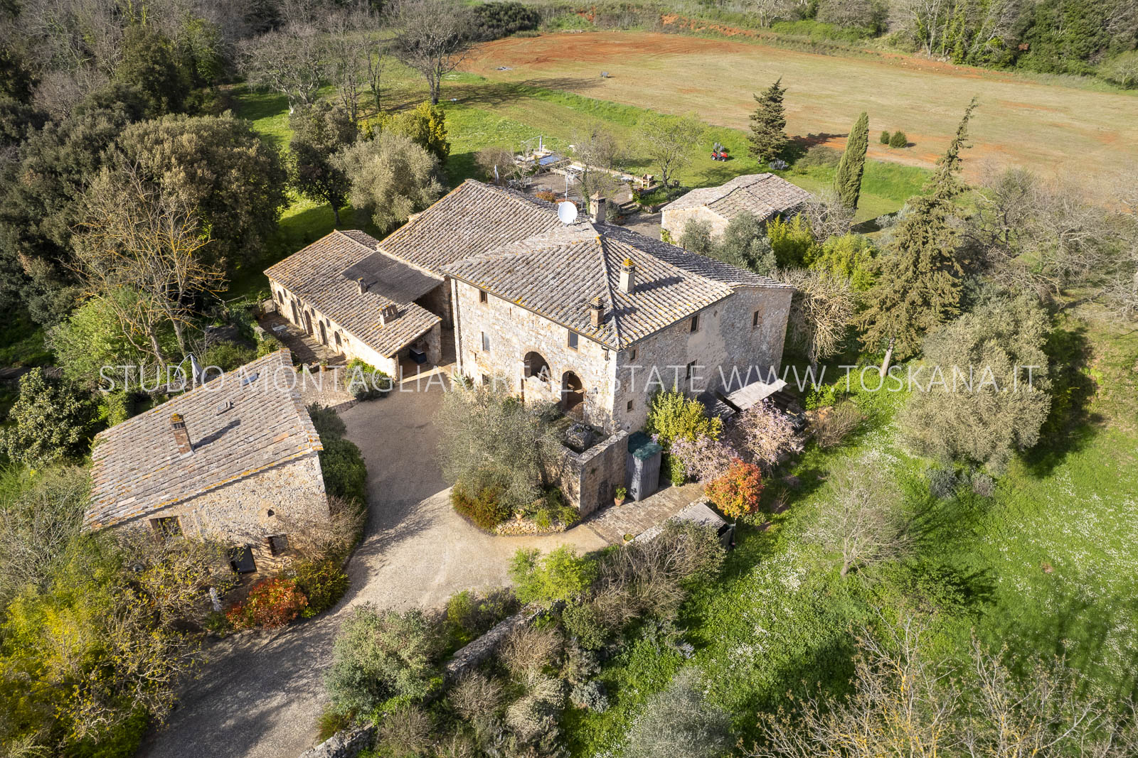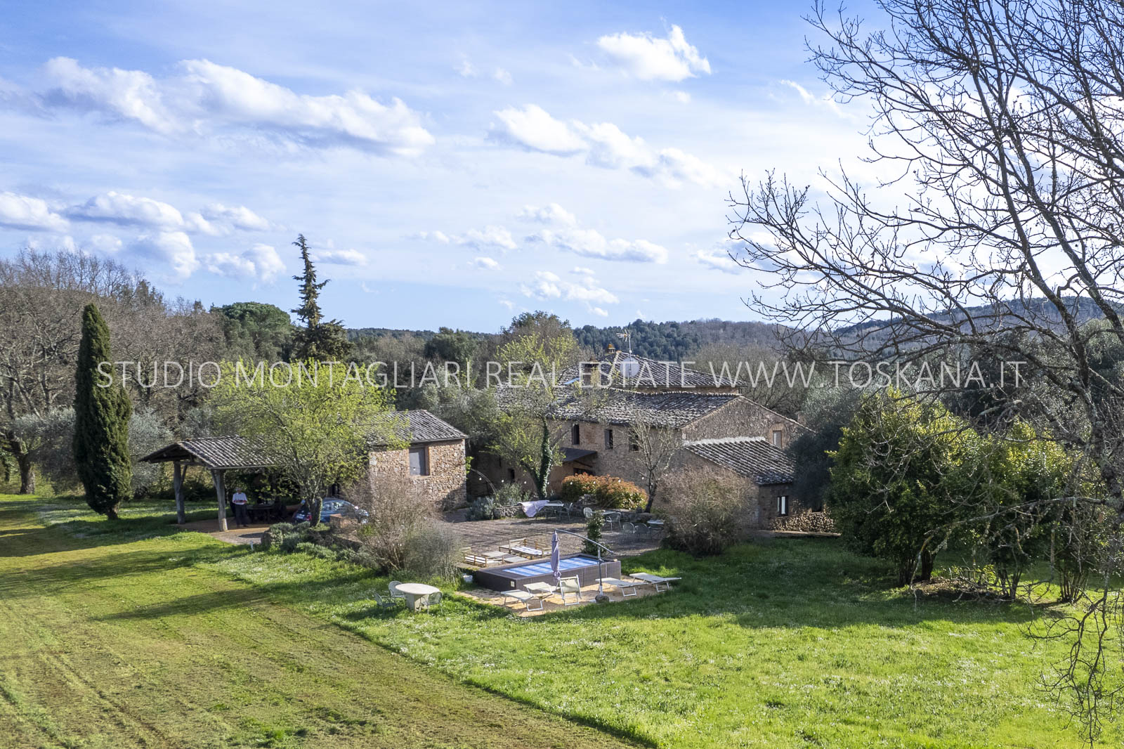 Completano la proprietà i 44 ettari di terreno circostanti con giardino, una piscina fuori terra, un ampio parcheggio, seminativo e bosco. Questa primavera è prevista la costruzione di una piscina interrata.