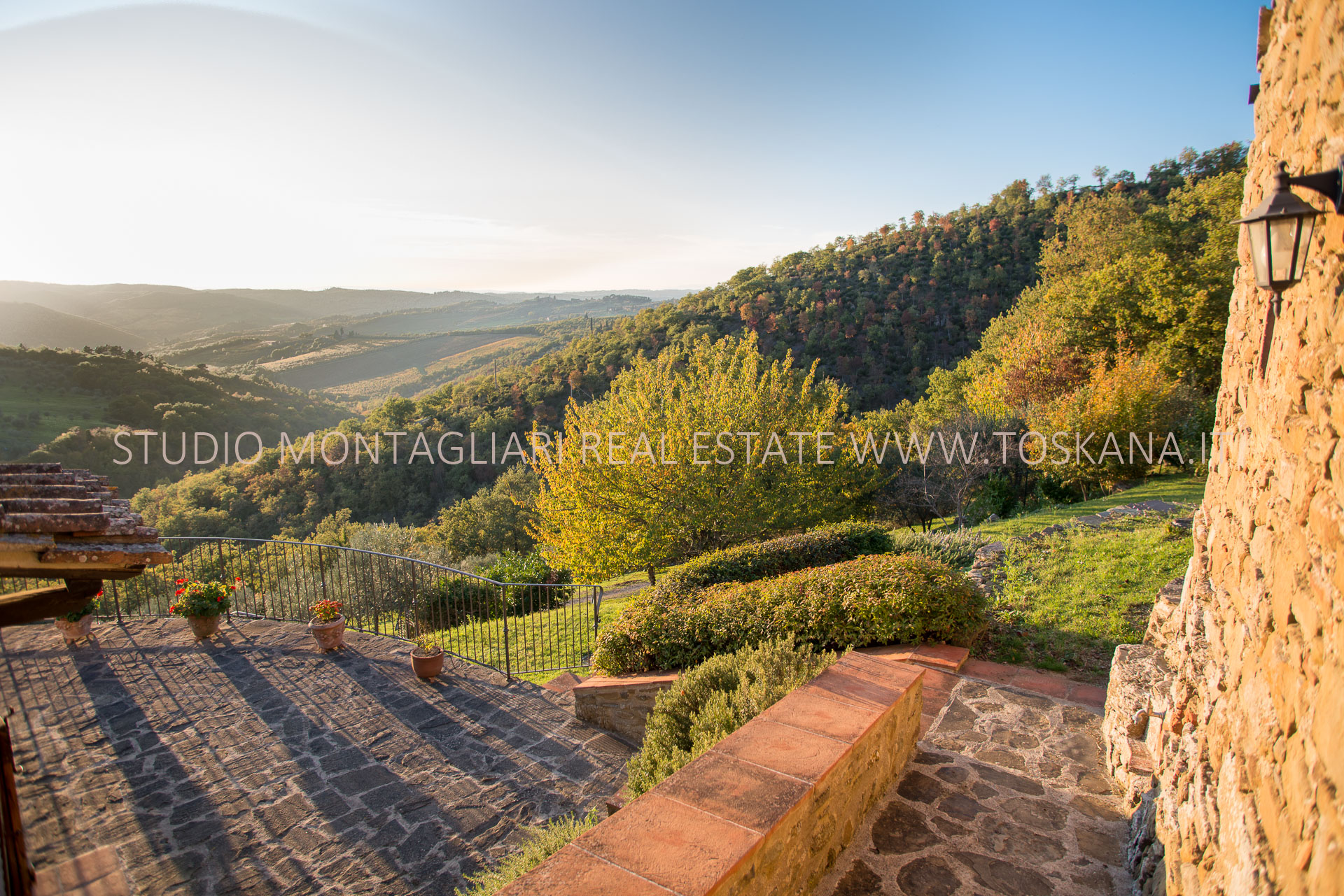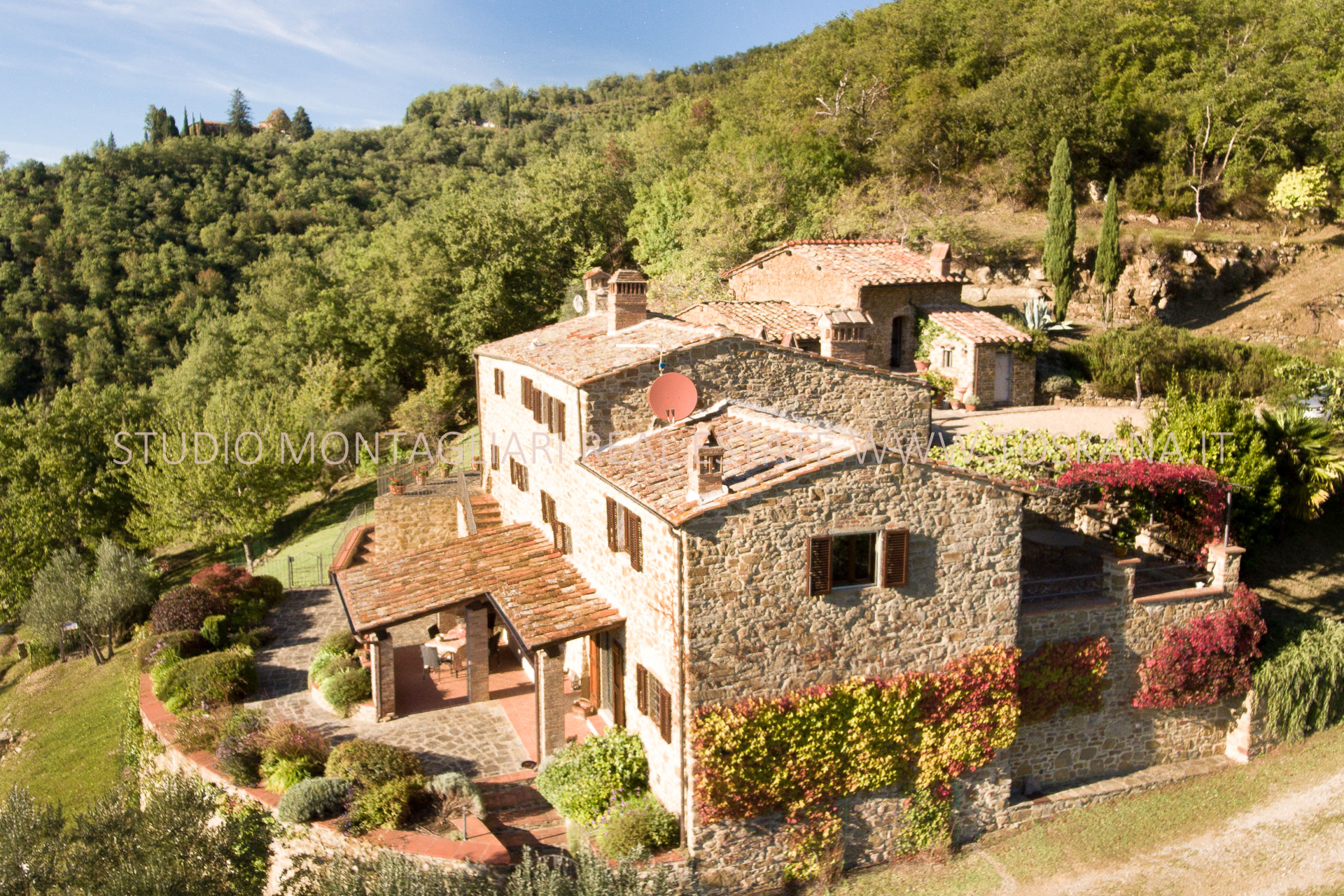 In posizione dominante con ampia vista panoramica si trova questo tipico casale toscano in pietra con annesso circondato da un giardino terrazzato e 7,2 ettari di terreno con 100 ulivi.