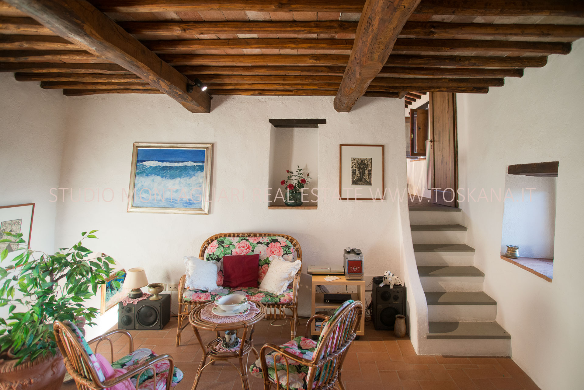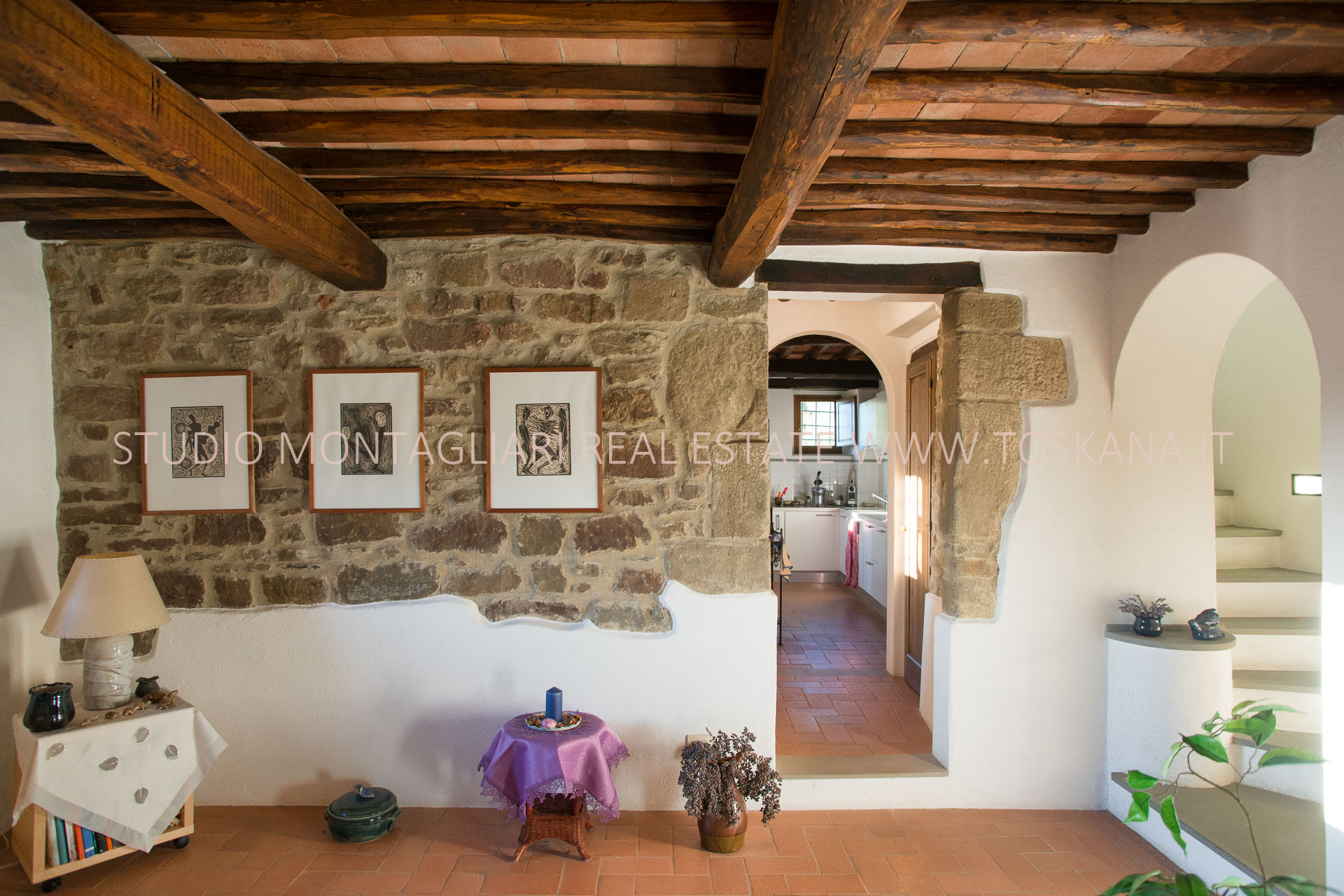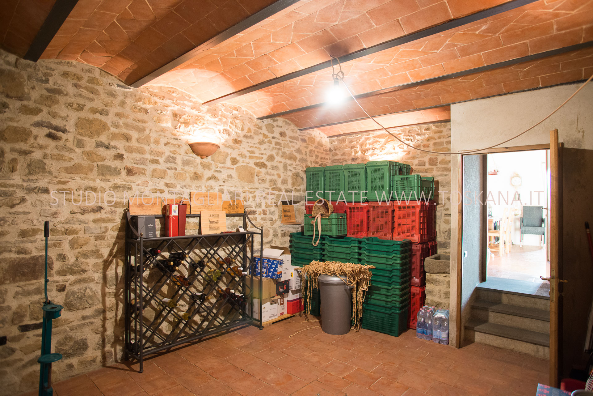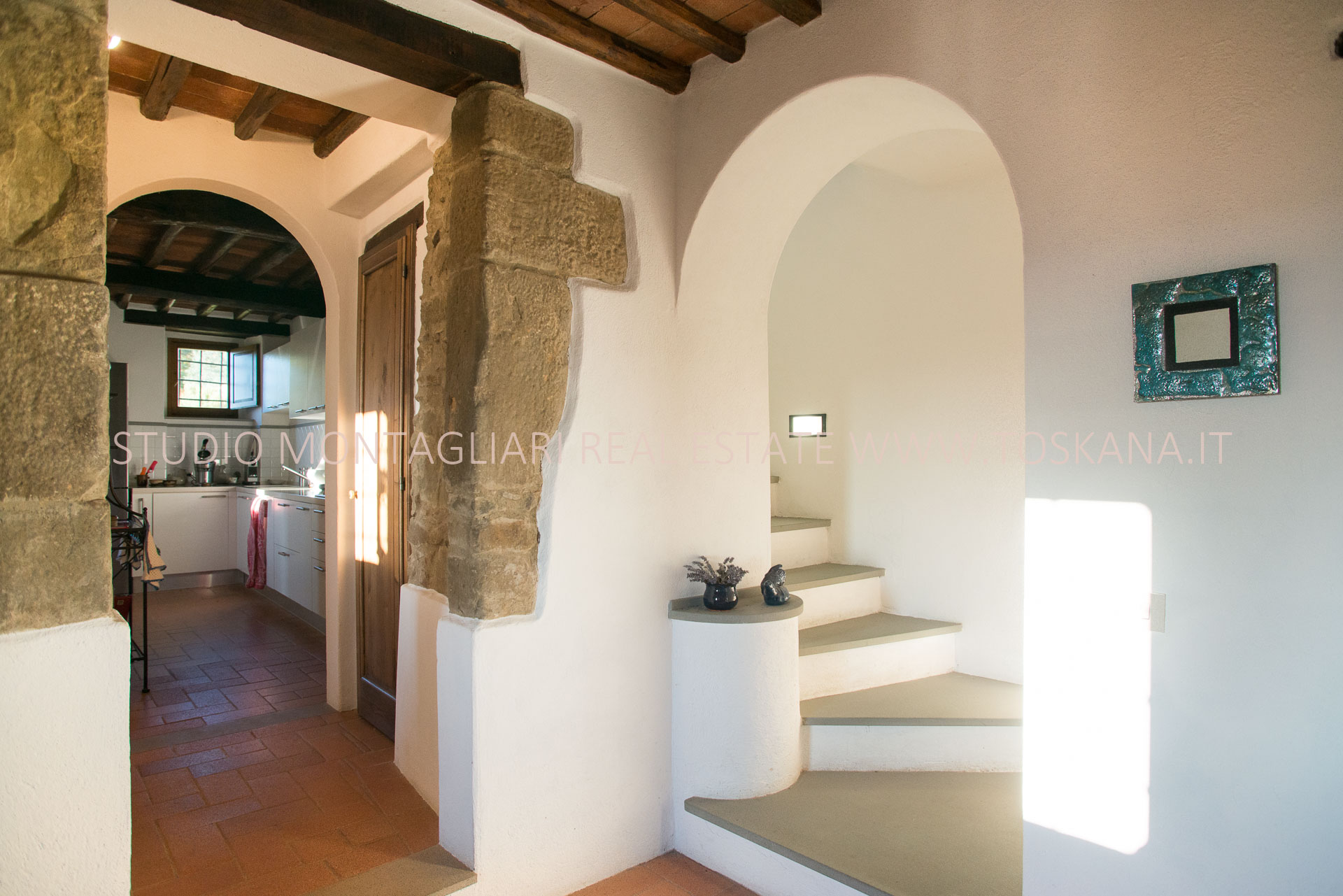 La casa principale dispone al primo piano di un ingresso con un antico forno, un ampio soggiorno con camino, un’ampia camera matrimoniale, uno studio o possibile camera singola ed un bagno in travertino con vasca e doccia. La scala in pietra serena porta al piano inferiore dove si trova un altro soggiorno, la cucina con zona pranzo e accesso diretto ad un terrazzino panoramico, un bagno in marmo con doccia e un'ampia una camera matrimoniale. Sul piano inferiore vi è la sala da pranzo formale con accesso alla caratteristica cantina a volta in cotto da un lato e l'uscita sulla terrazza e loggia per mangiare al fresco. La vista è strepitosa e da qui si vedono tramonti spettacolari.