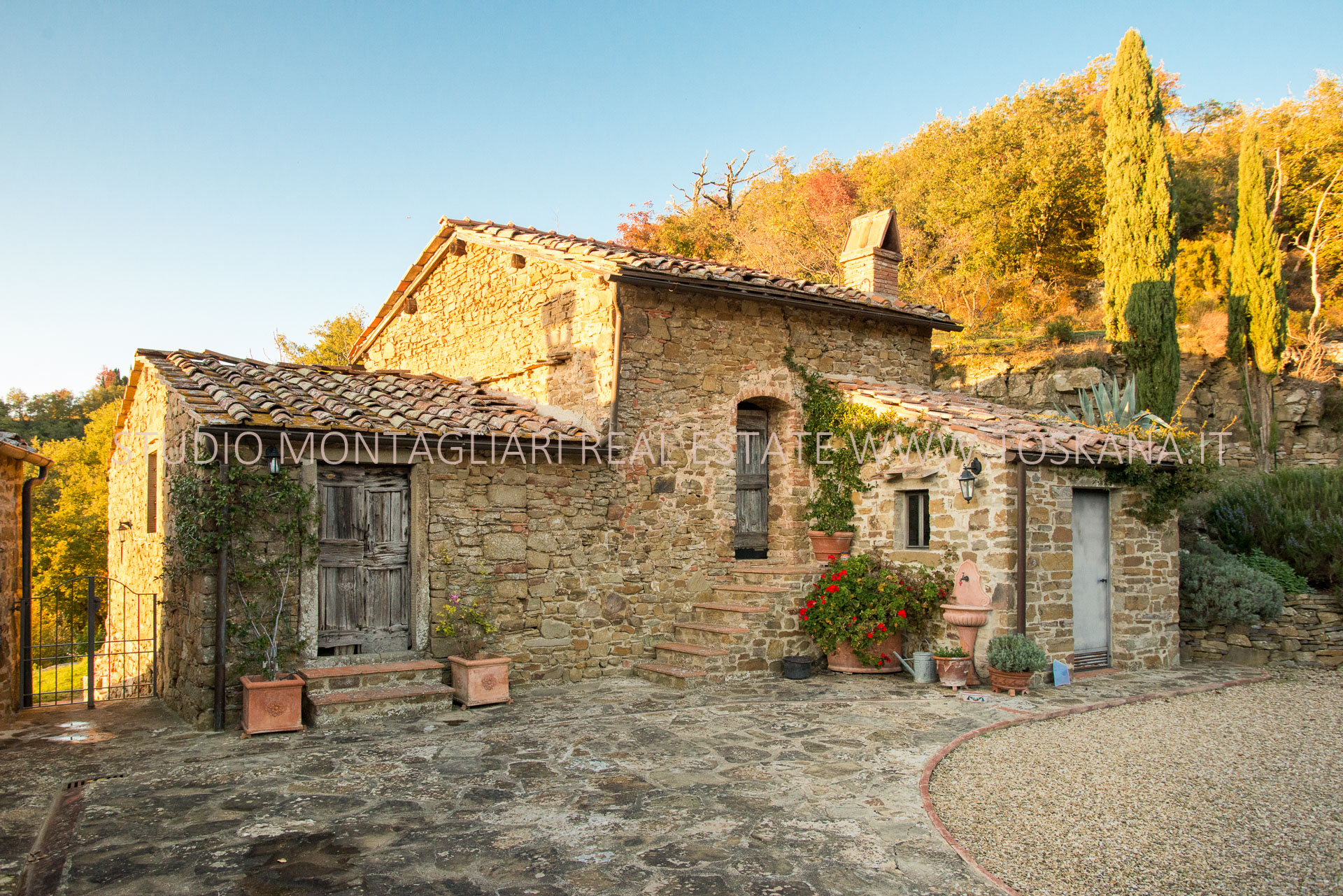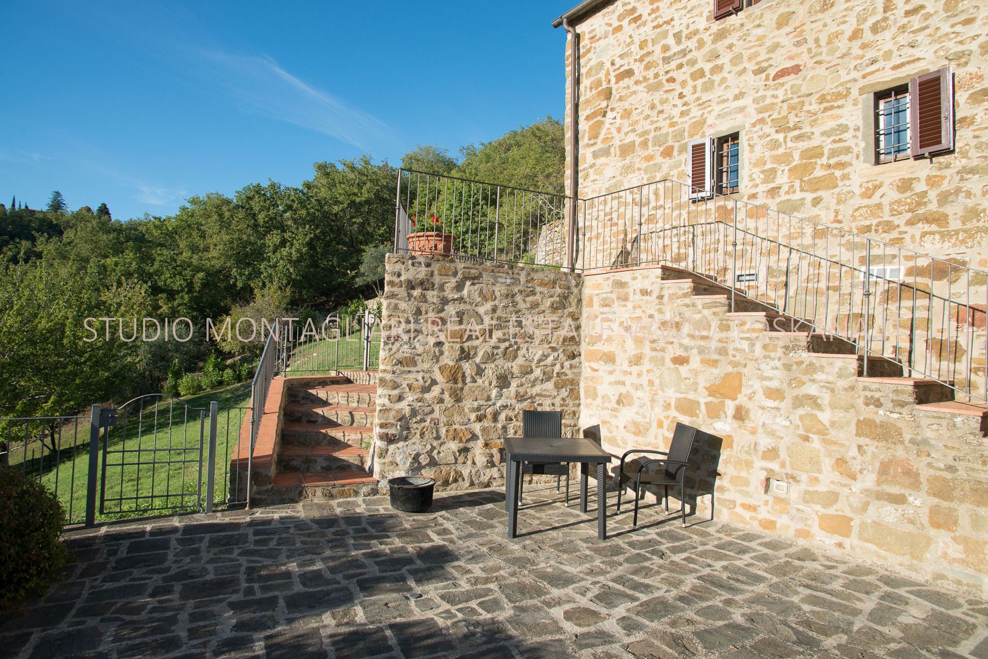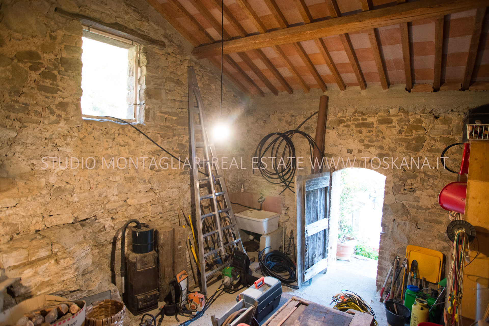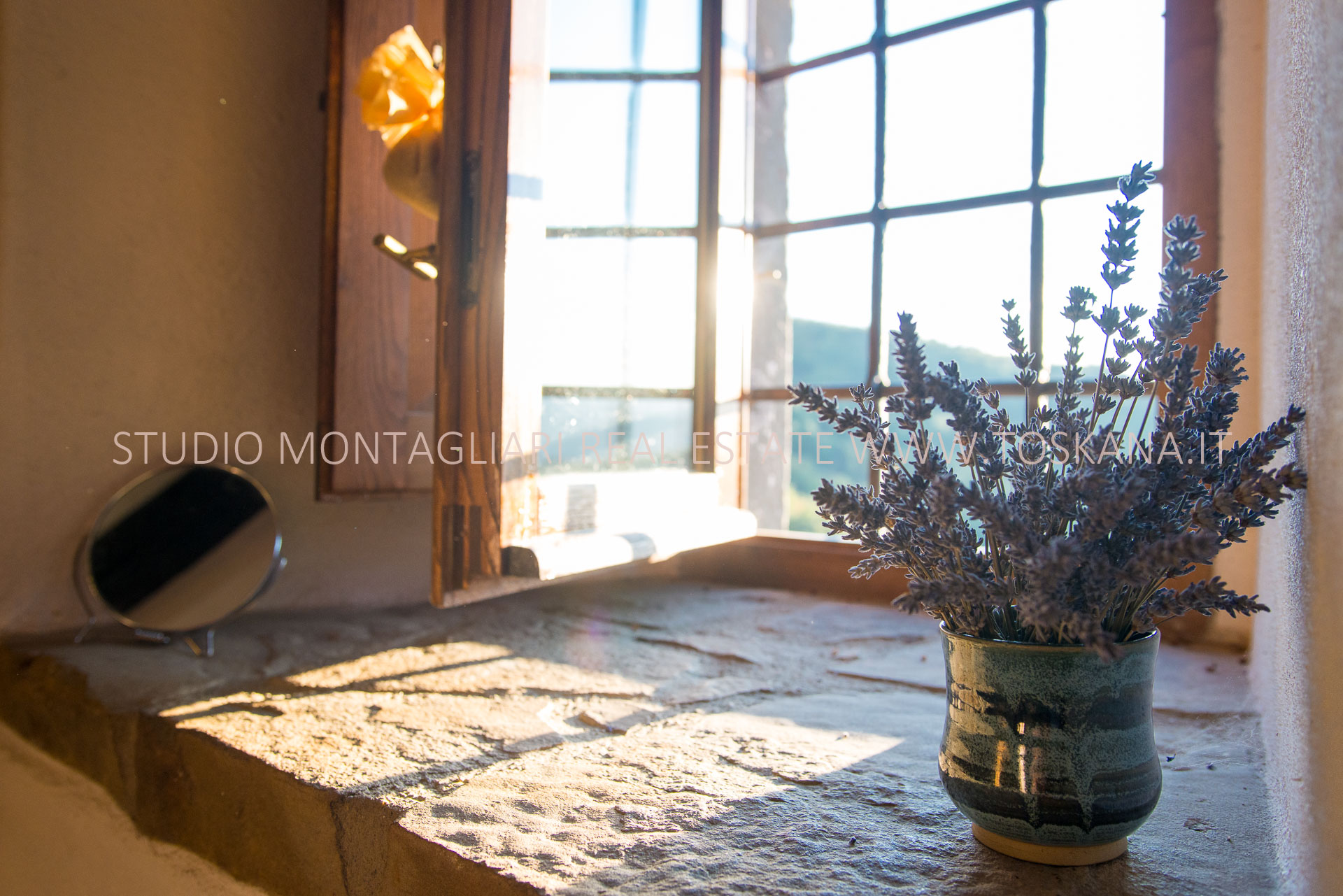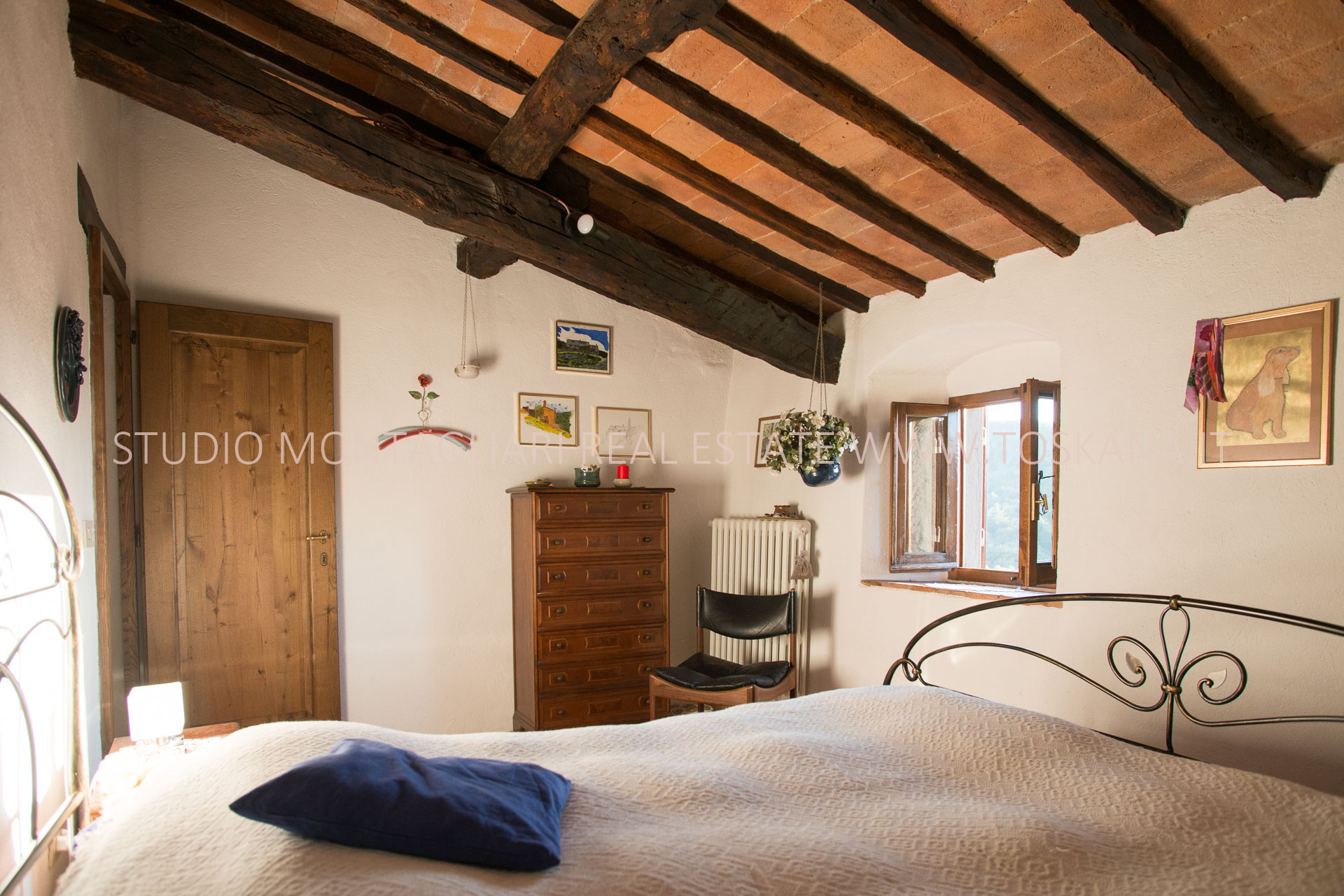La casa principale dispone al primo piano di un ingresso con un antico forno, un ampio soggiorno con camino, un’ampia camera matrimoniale, uno studio o possibile camera singola ed un bagno in travertino con vasca e doccia. La scala in pietra serena porta al piano inferiore dove si trova un altro soggiorno, la cucina con zona pranzo e accesso diretto ad un terrazzino panoramico, un bagno in marmo con doccia e un'ampia una camera matrimoniale. Sul piano inferiore vi è la sala da pranzo formale con accesso alla caratteristica cantina a volta in cotto da un lato e l'uscita sulla terrazza e loggia per mangiare al fresco. La vista è strepitosa e da qui si vedono tramonti spettacolari.