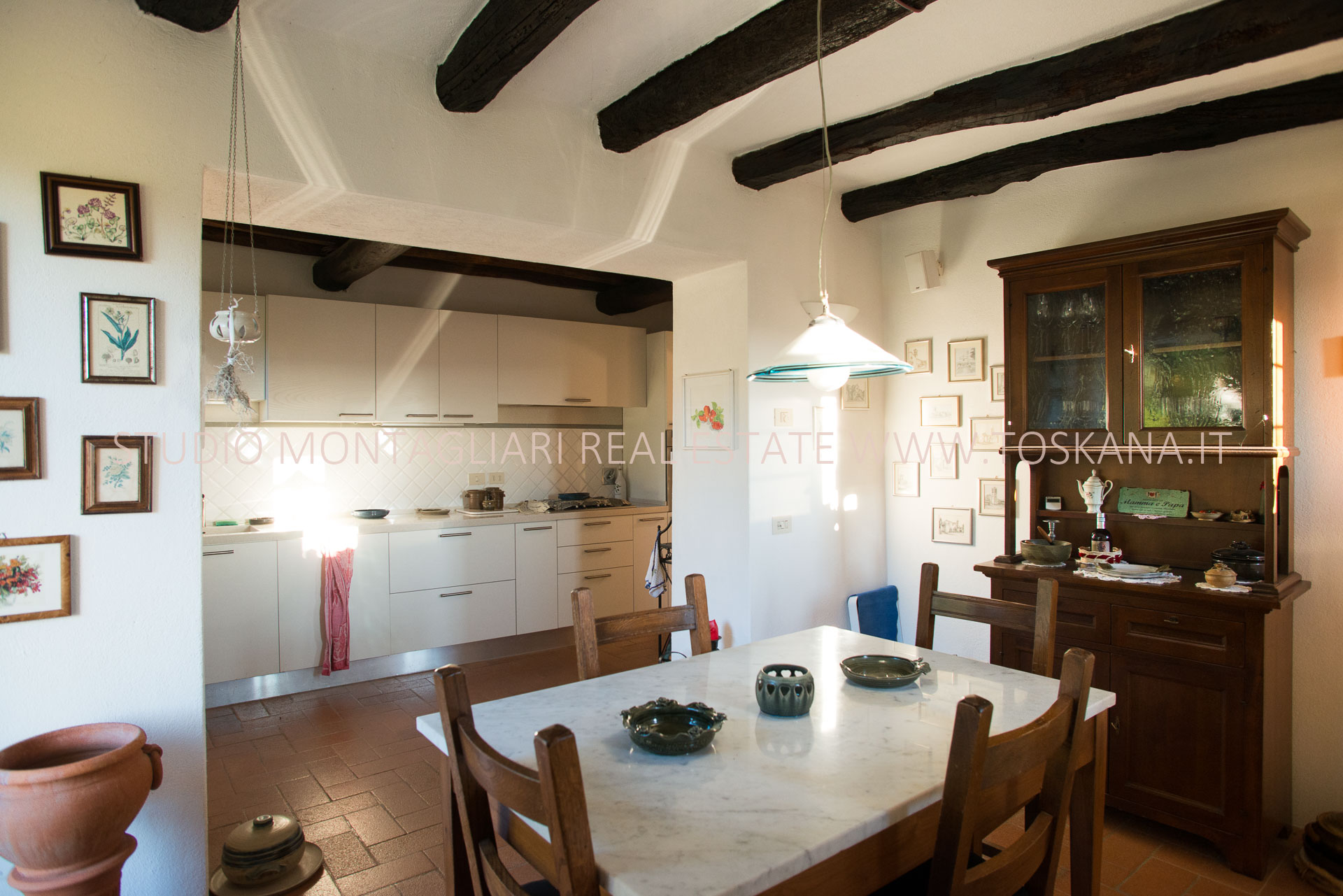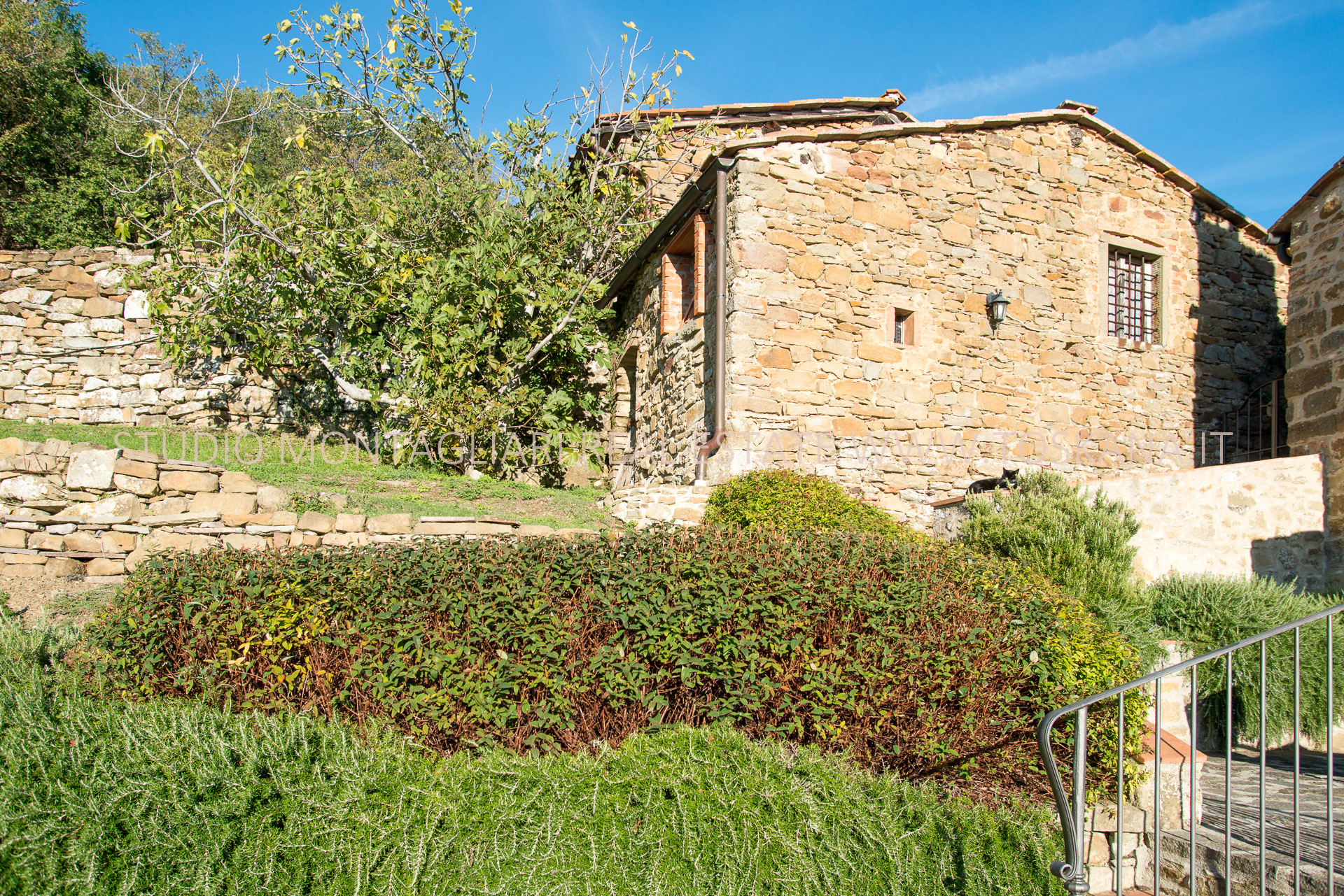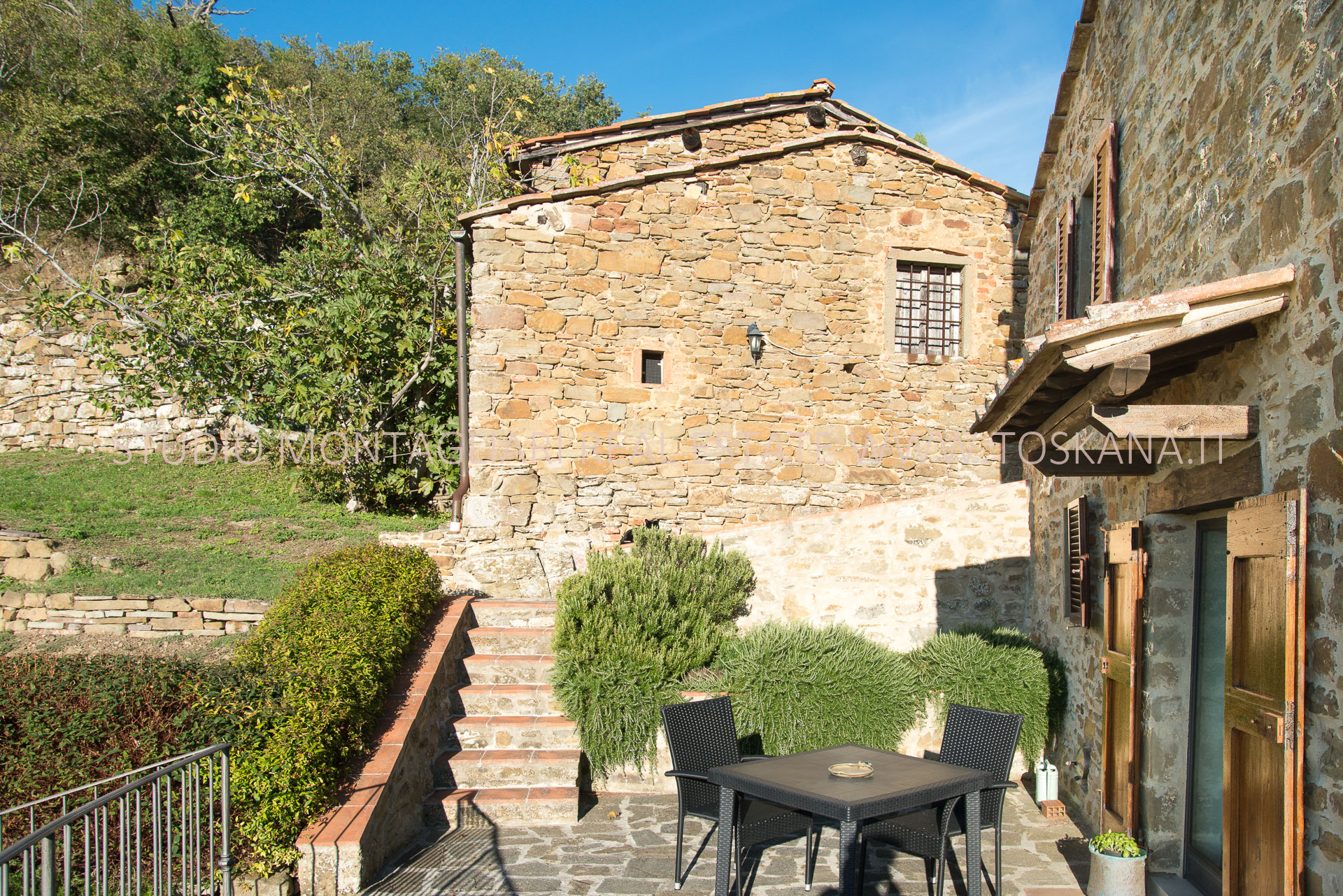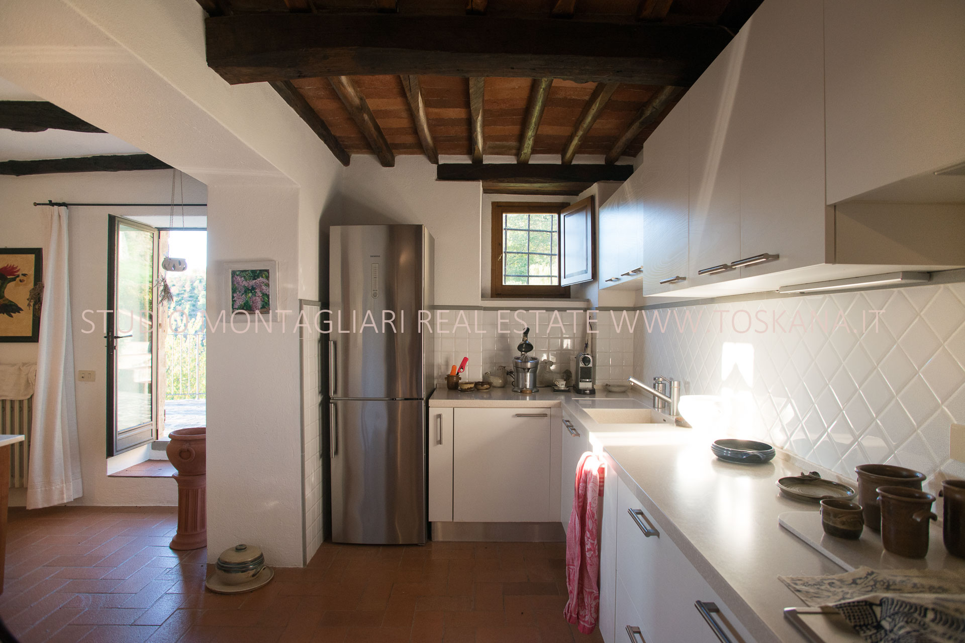 La casa principale dispone al primo piano di un ingresso con un antico forno, un ampio soggiorno con camino, un’ampia camera matrimoniale, uno studio o possibile camera singola ed un bagno in travertino con vasca e doccia. La scala in pietra serena porta al piano inferiore dove si trova un altro soggiorno, la cucina con zona pranzo e accesso diretto ad un terrazzino panoramico, un bagno in marmo con doccia e un'ampia una camera matrimoniale. Sul piano inferiore vi è la sala da pranzo formale con accesso alla caratteristica cantina a volta in cotto da un lato e l'uscita sulla terrazza e loggia per mangiare al fresco. La vista è strepitosa e da qui si vedono tramonti spettacolari.