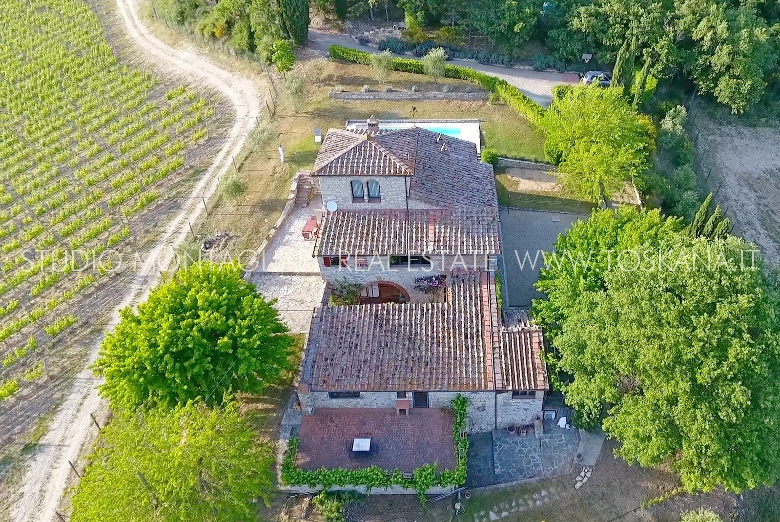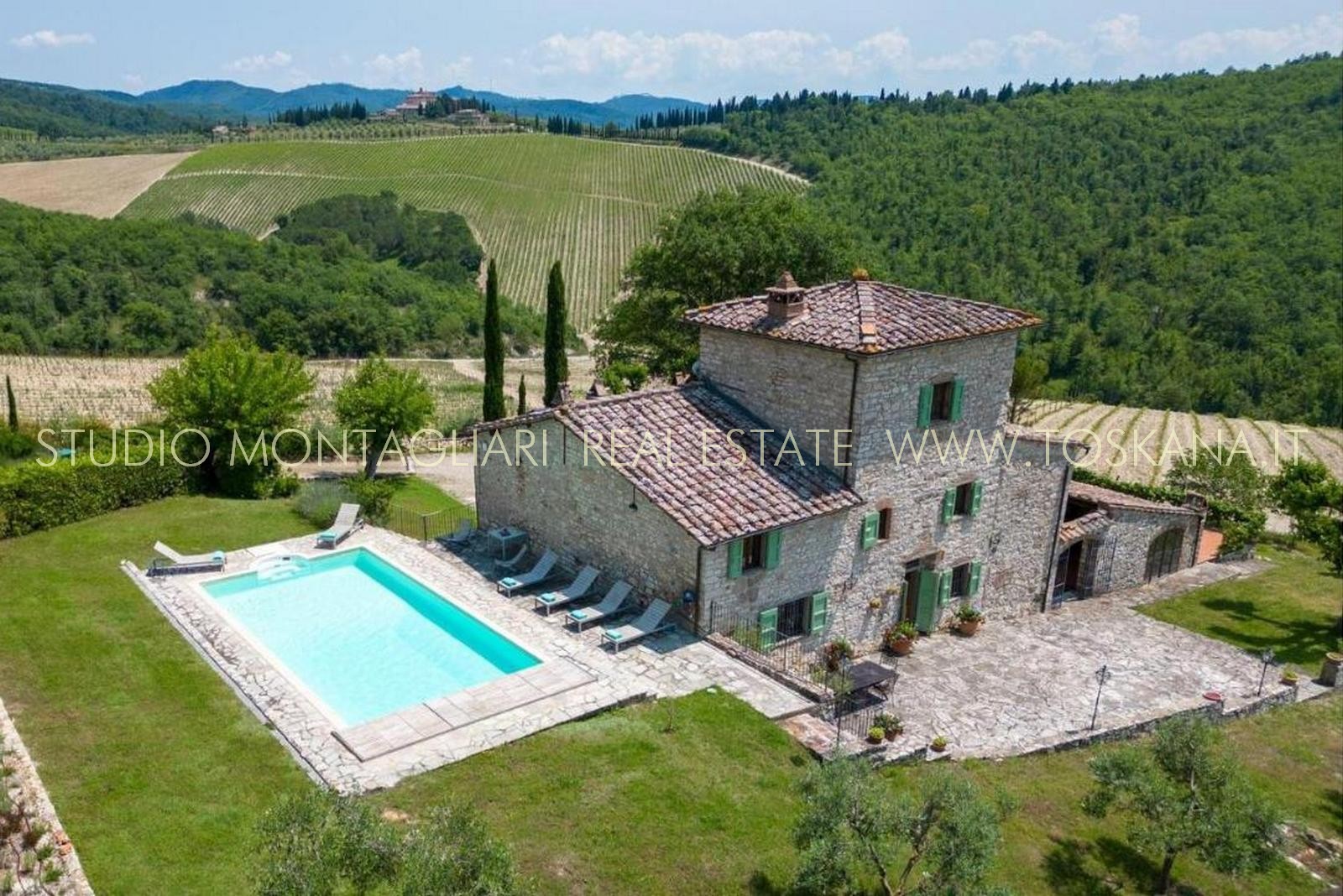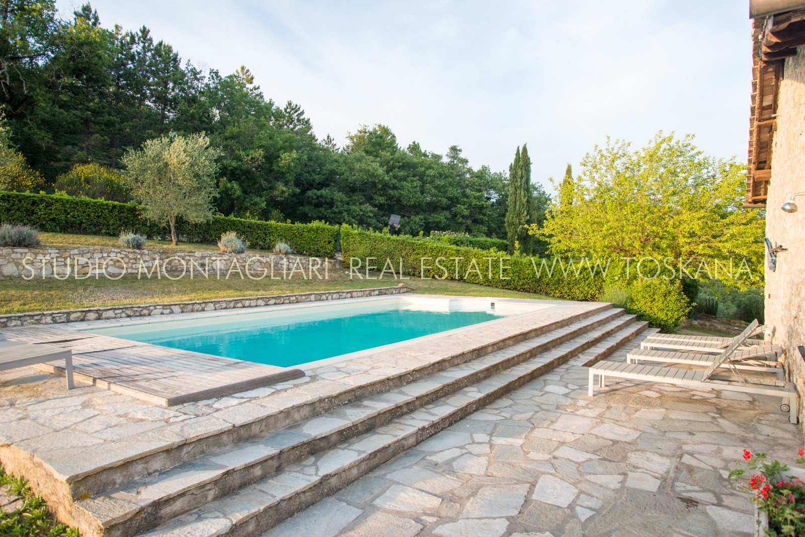 La proprietà è immersa in un ettaro di terreno privato con una piscina. Due ampie terrazze pavimentate in cotto e pietra accostano la casa. L'accesso è facile, senza alcuna strada bianca.