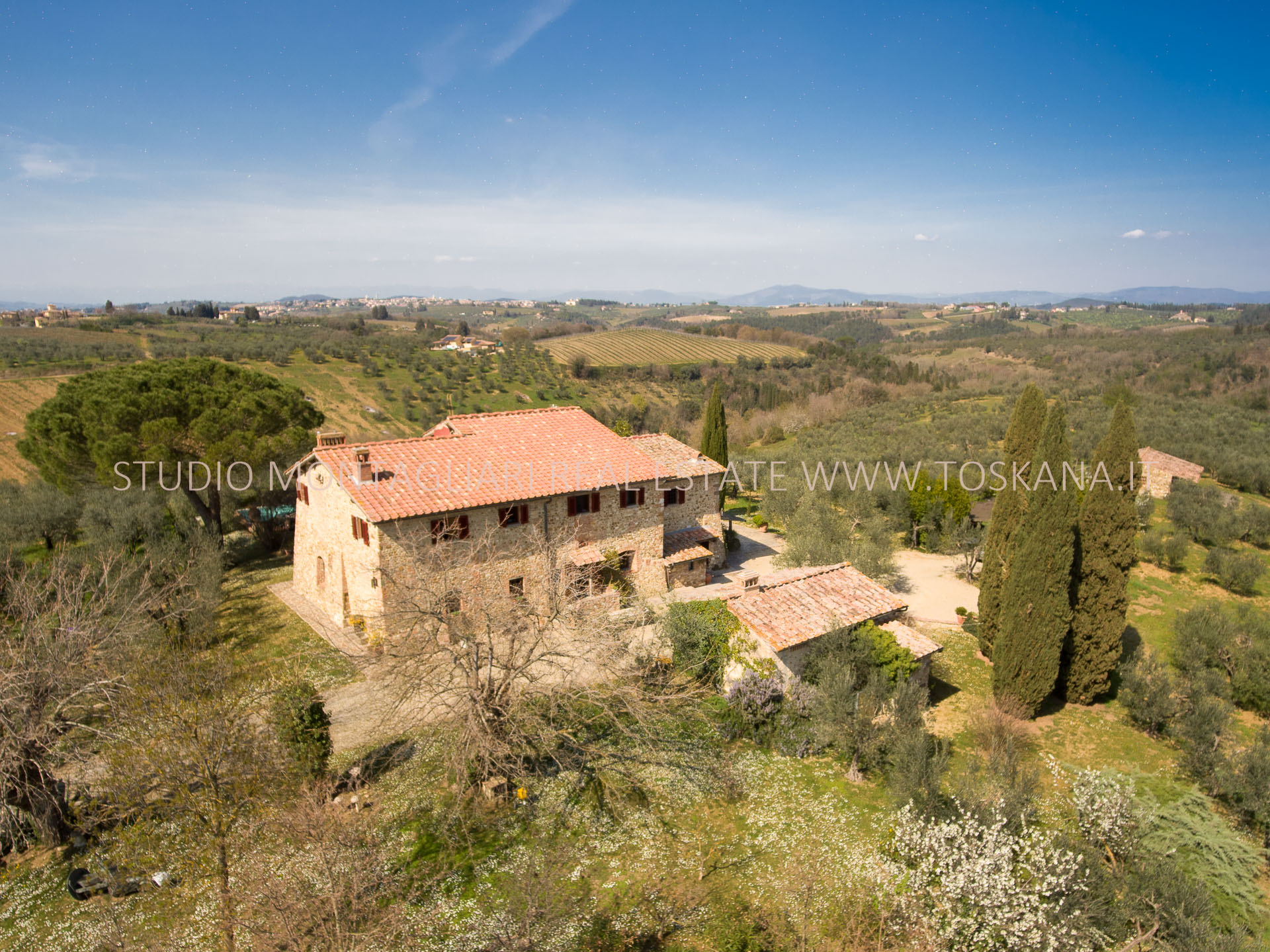 Questa antica tenuta agricola si trova a soli 20 km da Firenze in posizione panoramica e immersa nel territorio del Chianti Classico, circondata da uliveti e filari di vigneti.