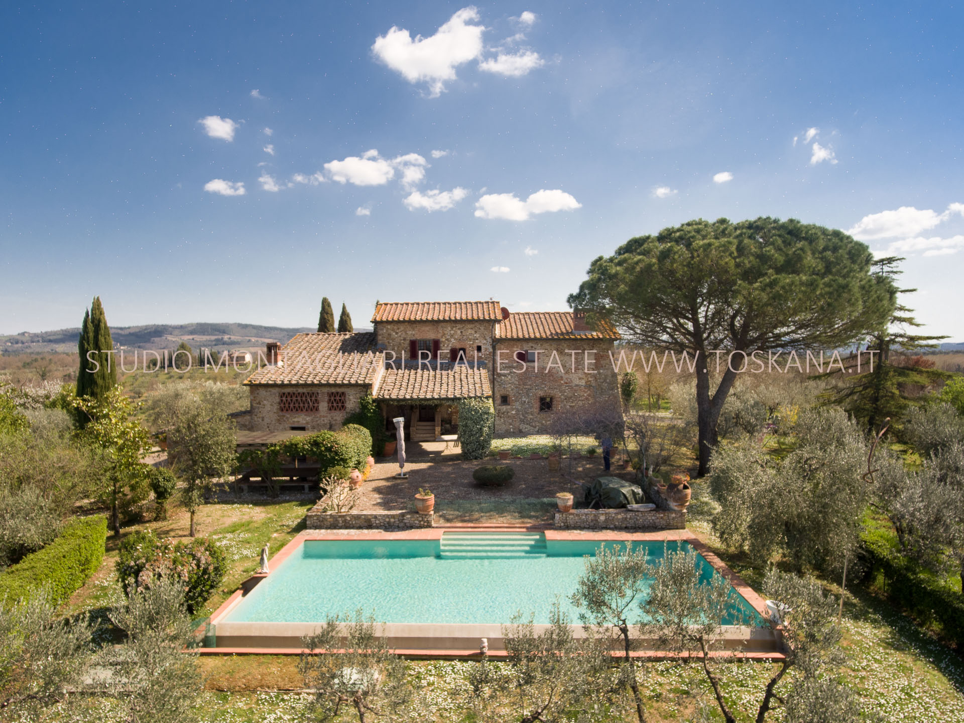 La casa padronale di 500 mq è su due livelli ed è stata completamente ristrutturata, rispettando l’architettura tradizione toscana con muri in pietra, pavimenti in cotto e travi in legno a vista. Oltre al casale principale è presente un ex porcile completamente ristrutturato e un fienile di ca. 70 mq di recente costruzione. Su una terrazza naturale, di fronte alla casa principale, si trova la piscina con vista panoramica sulla campagna toscana circostante.