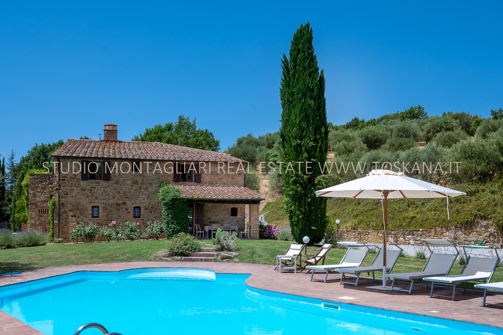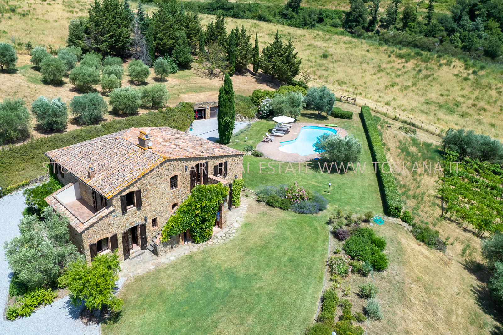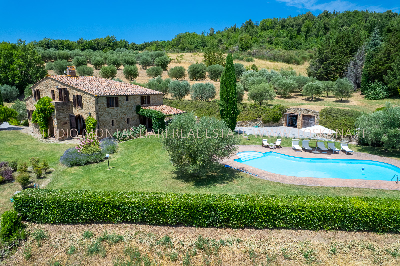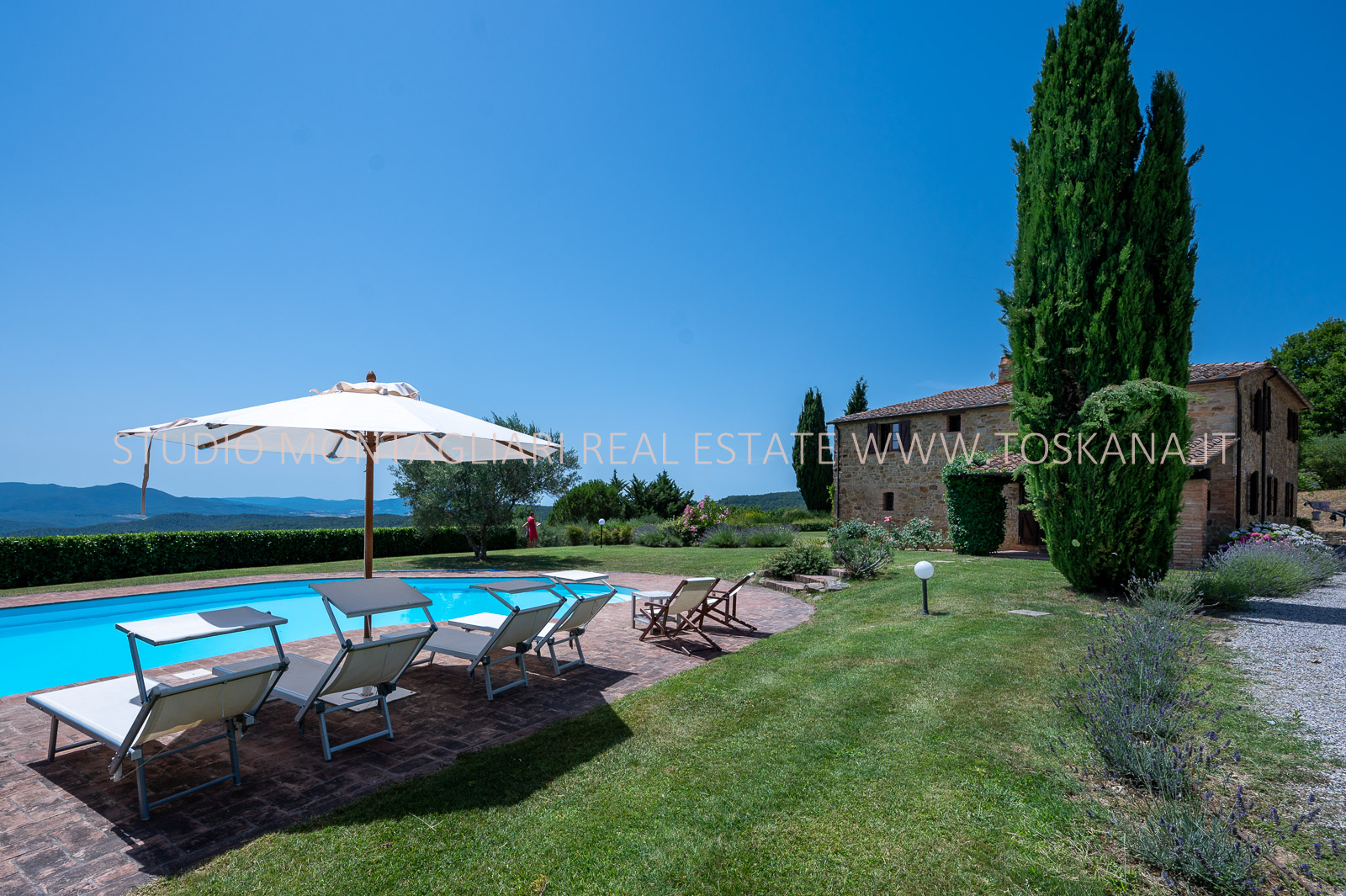 Un giardino paesaggistico con vista panoramica, una piscina 12 x 6 mt., cipressi e un garage per due macchine completano questa offerta.