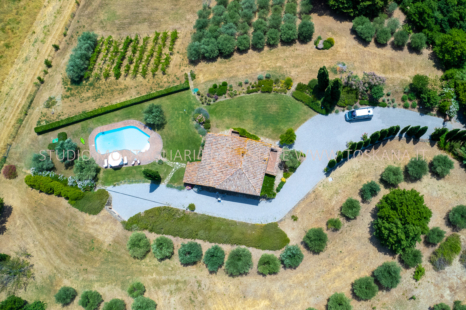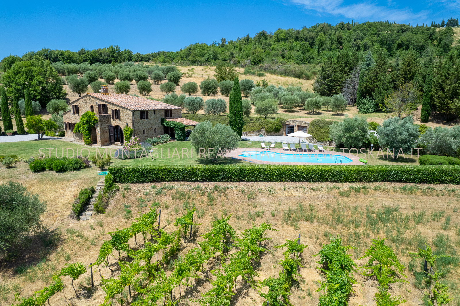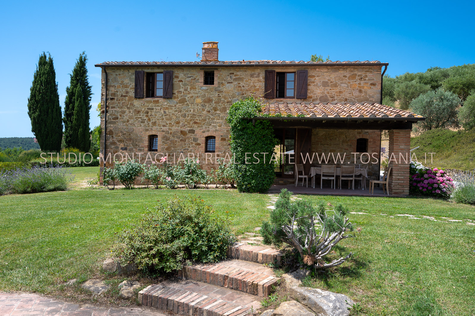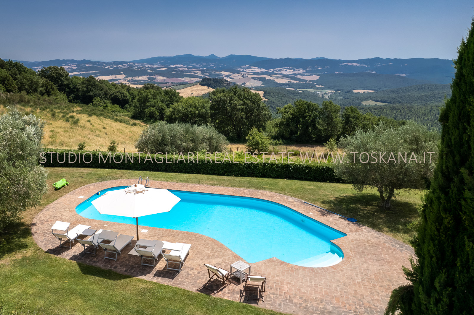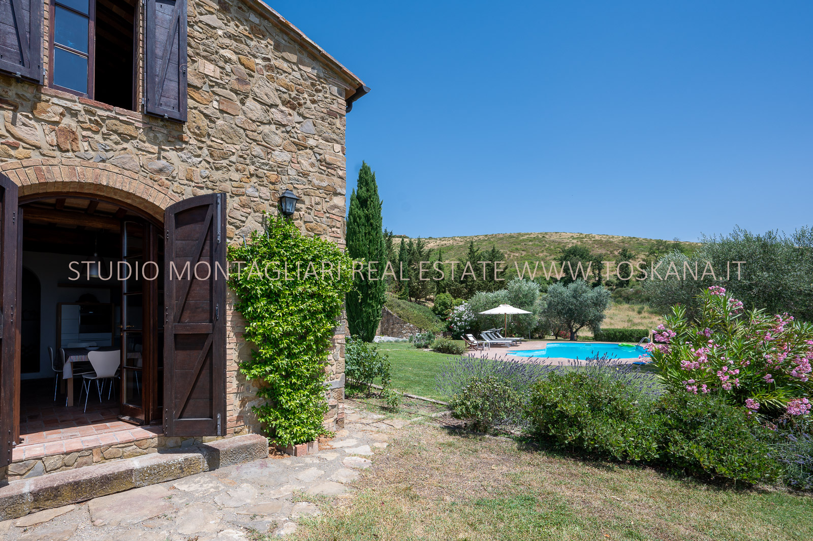 Un giardino paesaggistico con vista panoramica, una piscina 12 x 6 mt., cipressi e un garage per due macchine completano questa offerta.