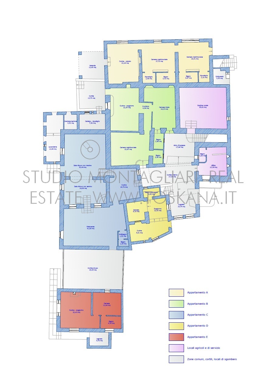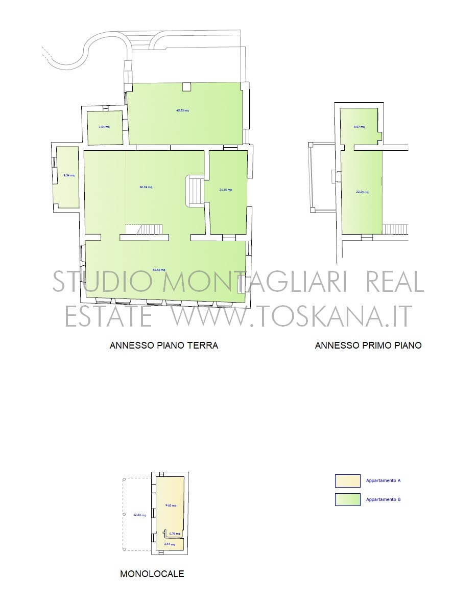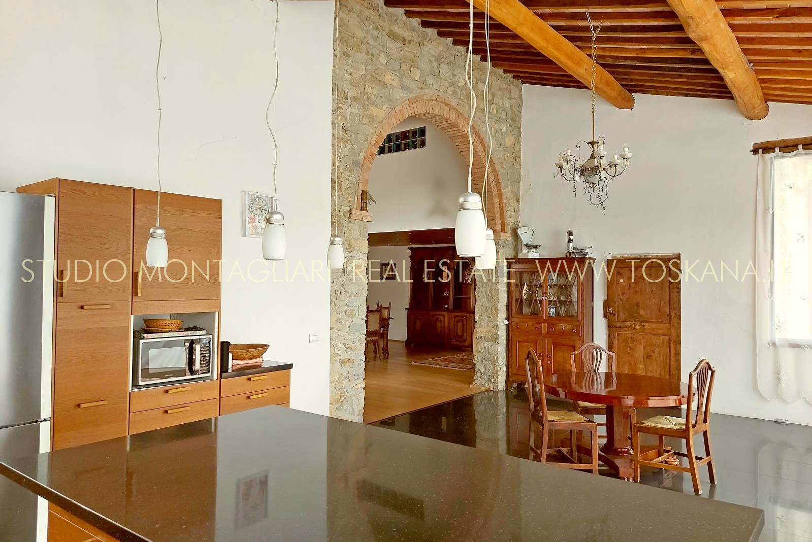 La superficie totale, tra la casa principale e l'annesso, è di 1.080 mq che dispongono di vari accessi esterni, alcuni si affacciano sul meraviglioso panorama circostanti ed altri sulla graziosa corte interna. I casali sono in pietra e conservano le caratteristiche della architettura toscana; all'interno troviamo travi in legno, pareti a vista, volte in mattoni e anche l'arredamento rispetta la tradizione contadina.