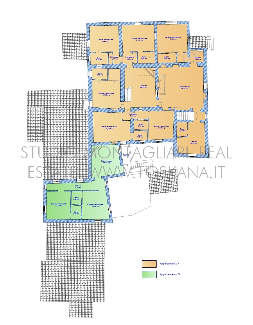 Adiacente al casale principale, collegato dall'aia, si trova l’annesso di circa 280 mq, che ospita oggi l'appartamento dei proprietari con 3 camere da letto, 3 bagni, ampio soggiorno e cucina moderna.