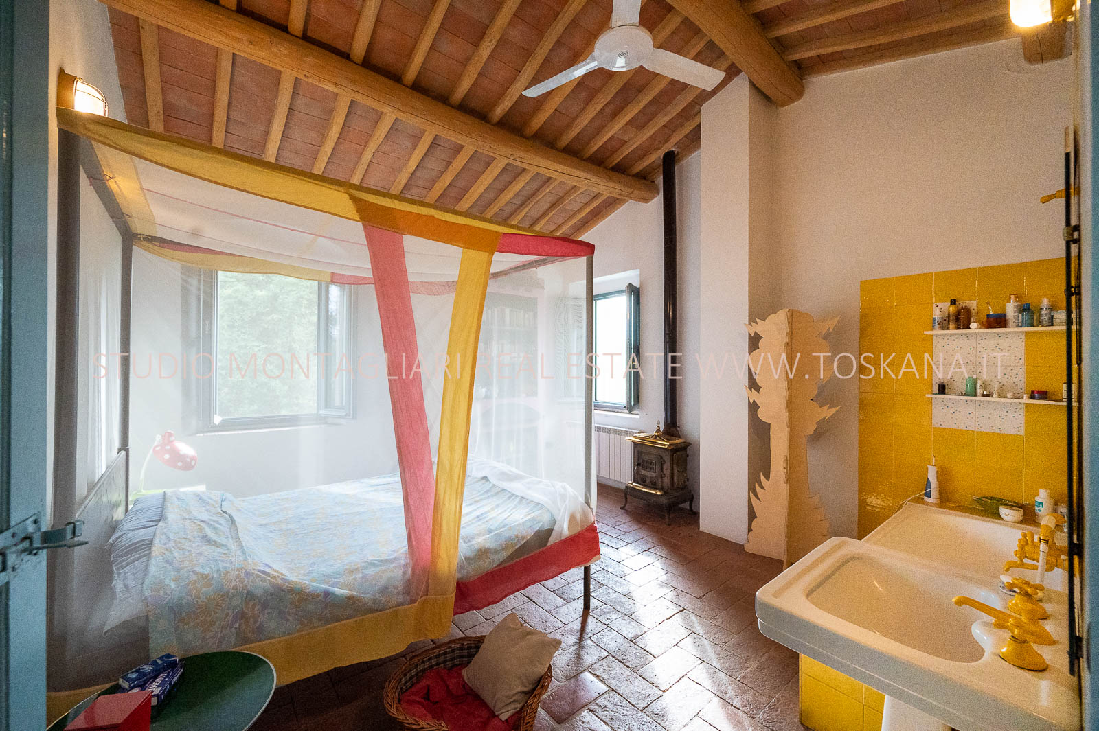 All’interno i spazi sono stati distribuiti in due unità che sono facilmente riunibuili di cui un apartamento su due piani con 5 camere da letto nonchè un monolocale con accesso indipendente.