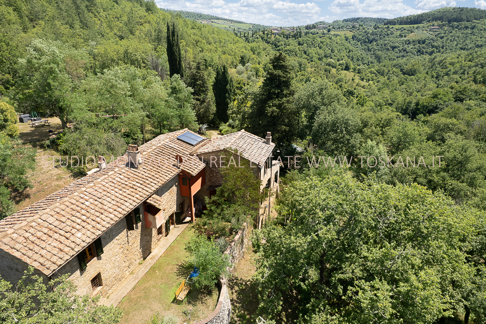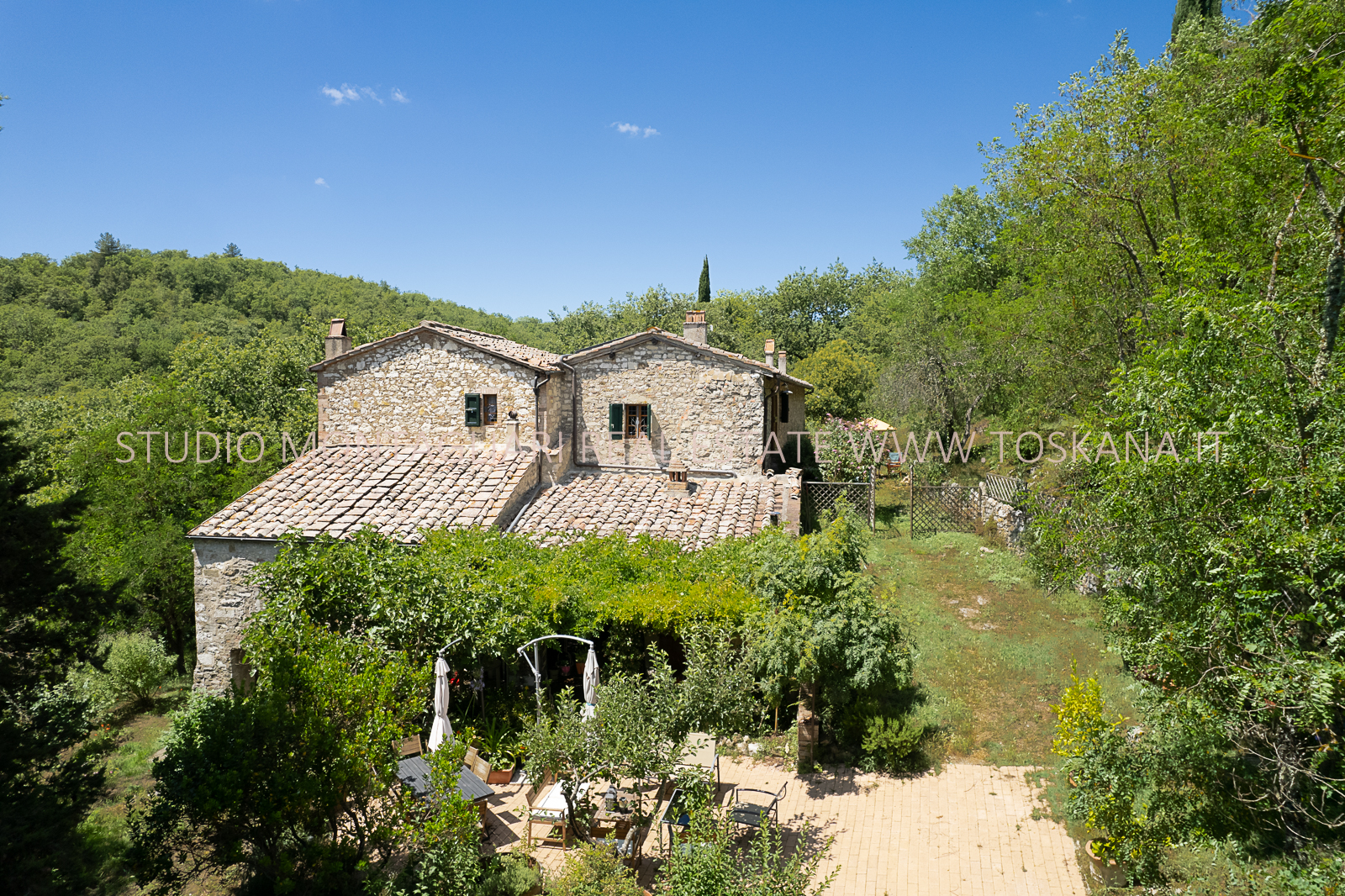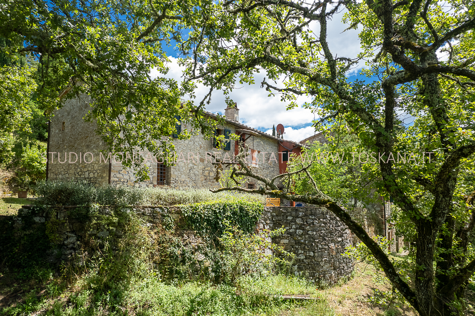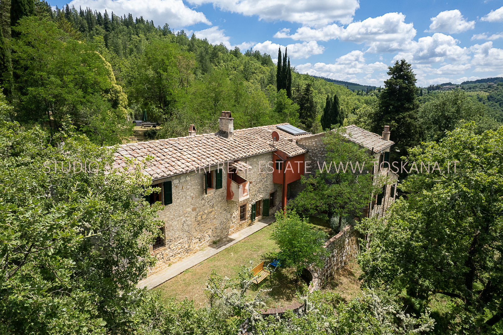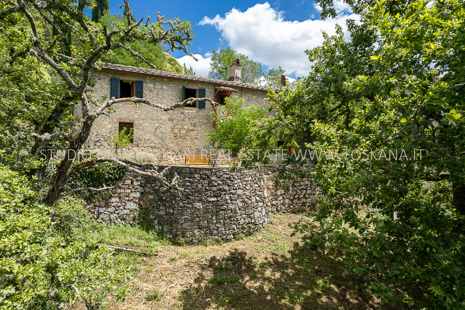 Nel cuore del Chianti Classico, tra Radda e Castellina, immerso in un luogo incantato fatto di boschi e accompagnato dal dolce suono di un ruscello, si trova questo tipico casale toscano con annesso e 3,5 ettari di terreno.