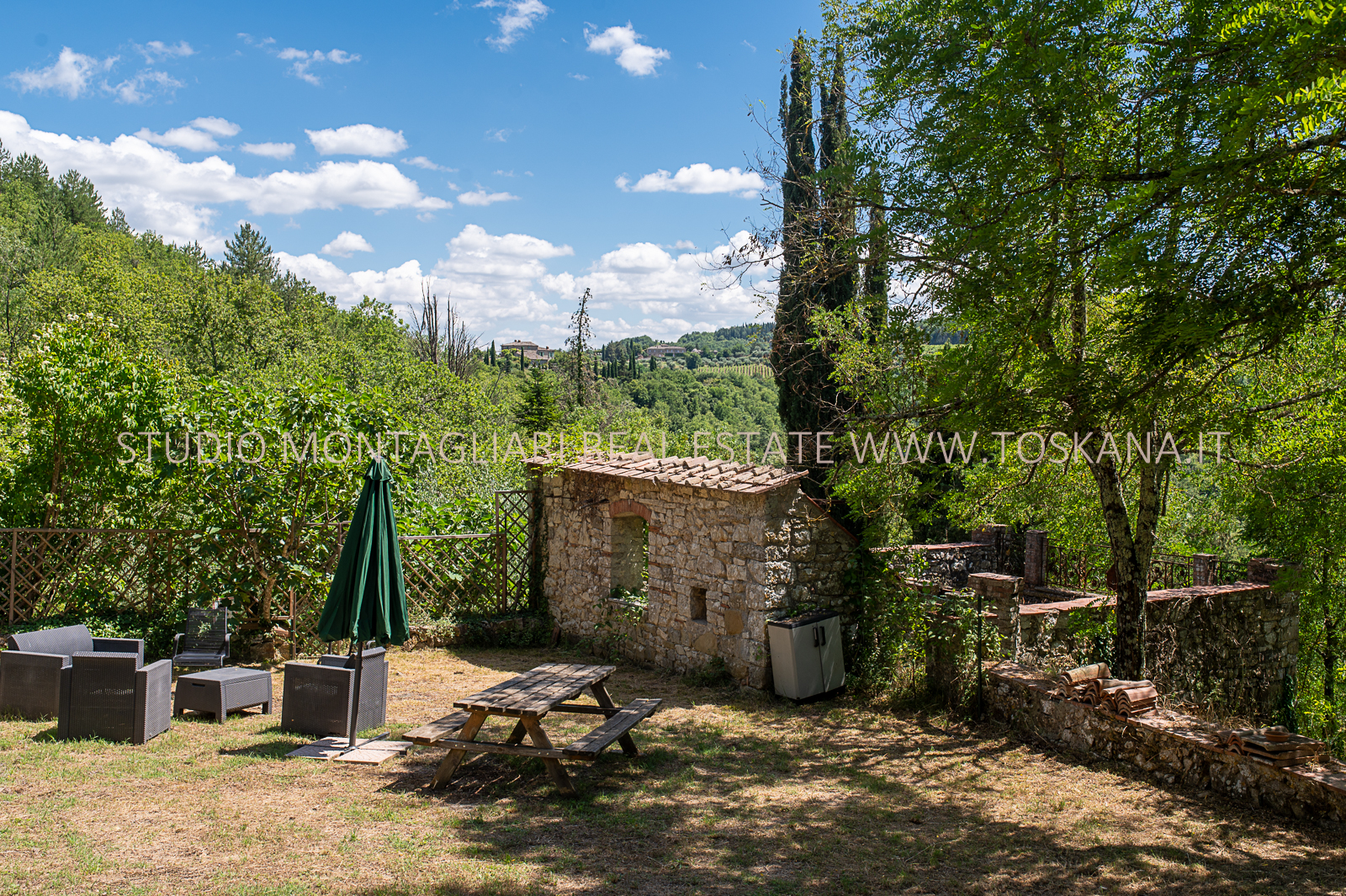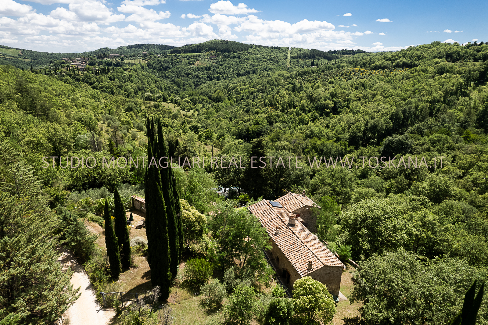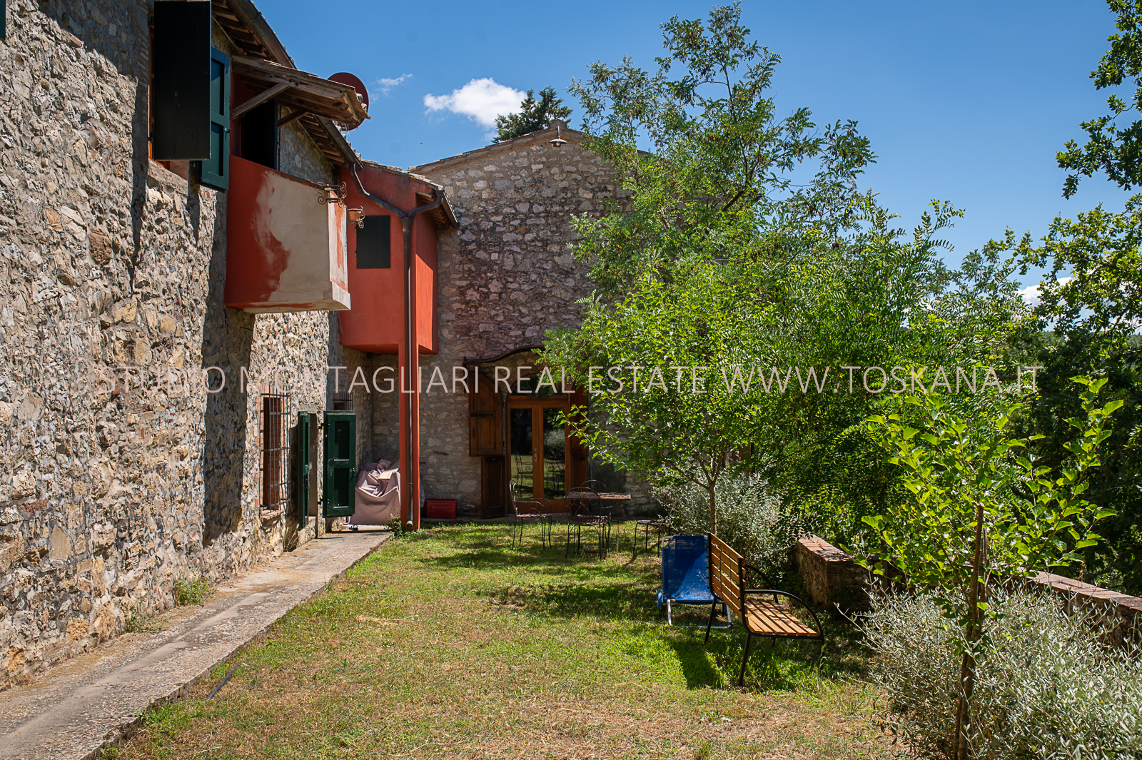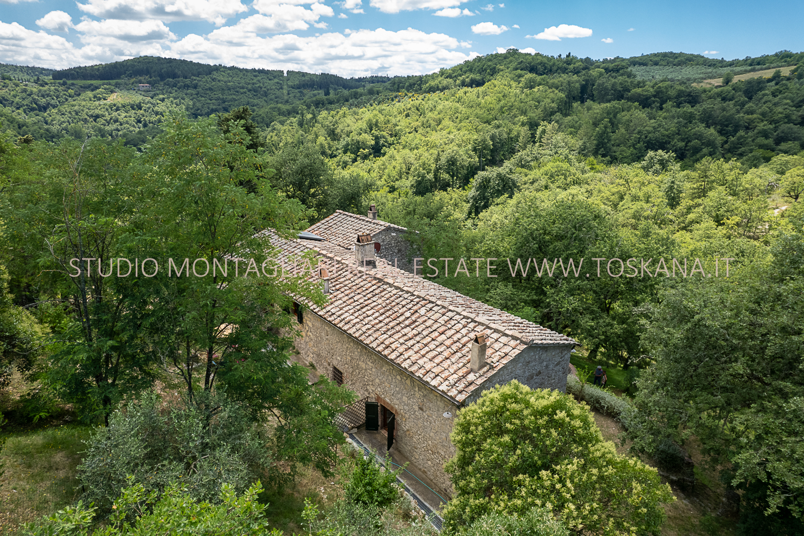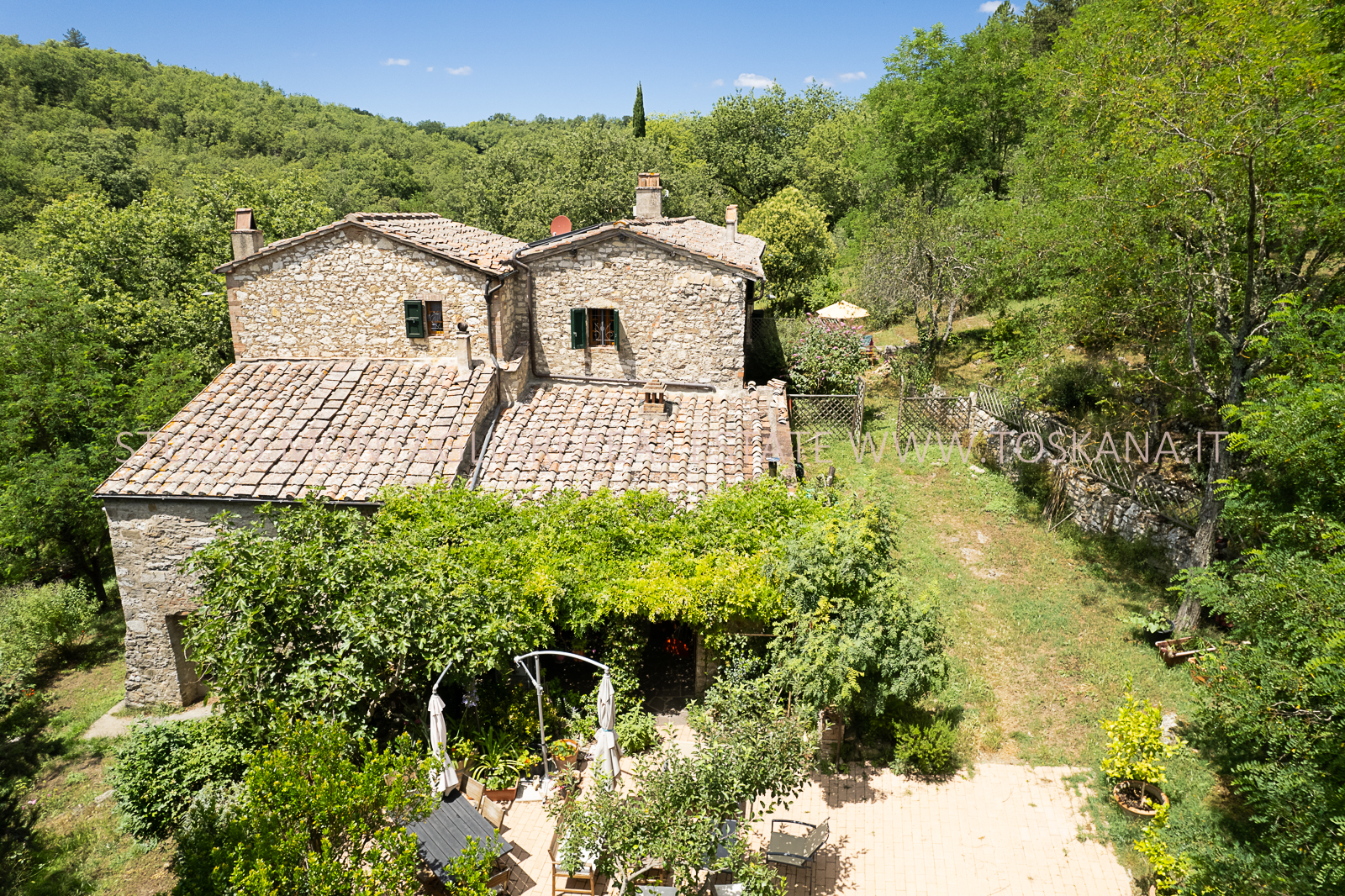 Nel cuore del Chianti Classico, tra Radda e Castellina, immerso in un luogo incantato fatto di boschi e accompagnato dal dolce suono di un ruscello, si trova questo tipico casale toscano con annesso e 3,5 ettari di terreno.