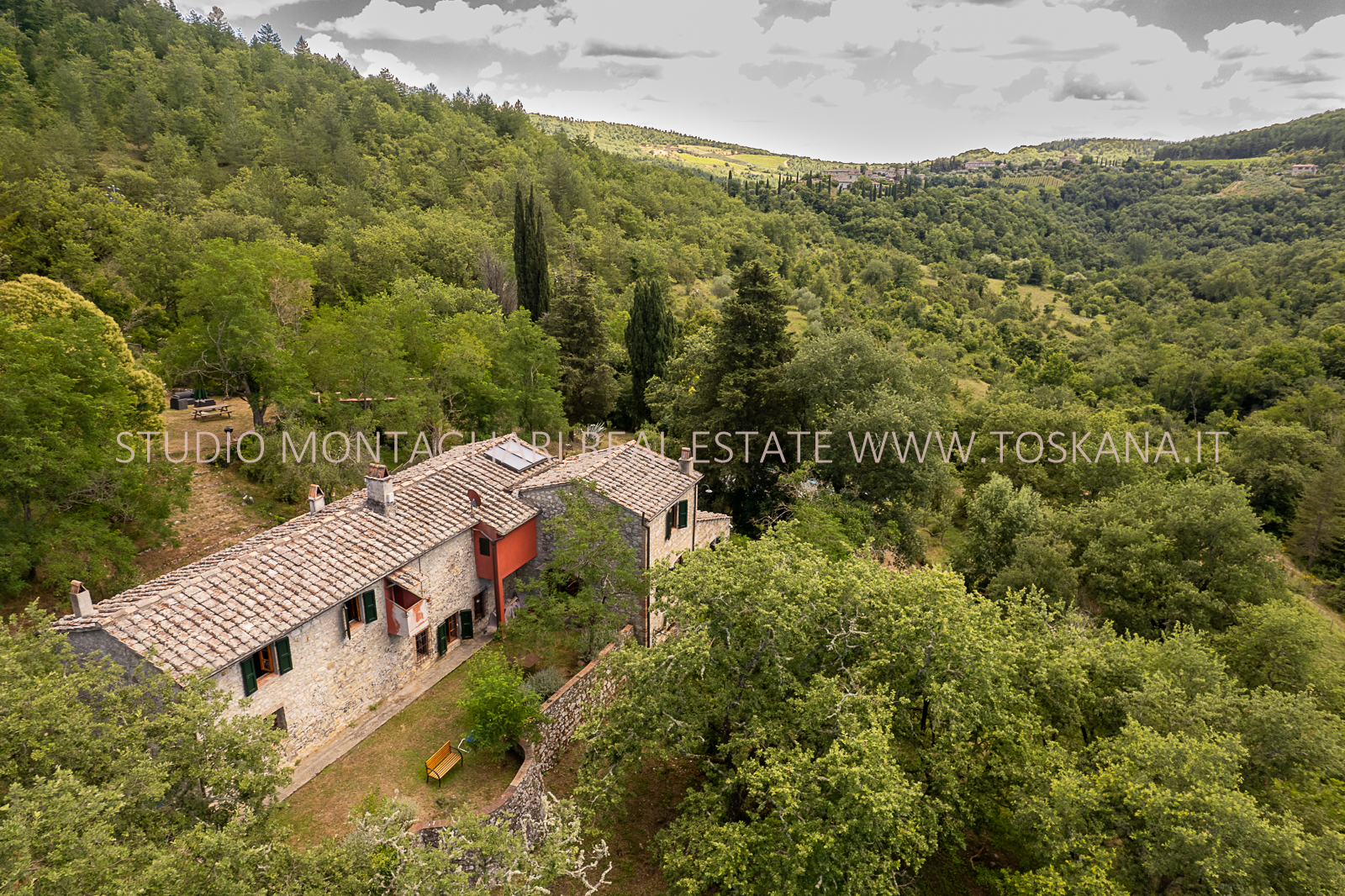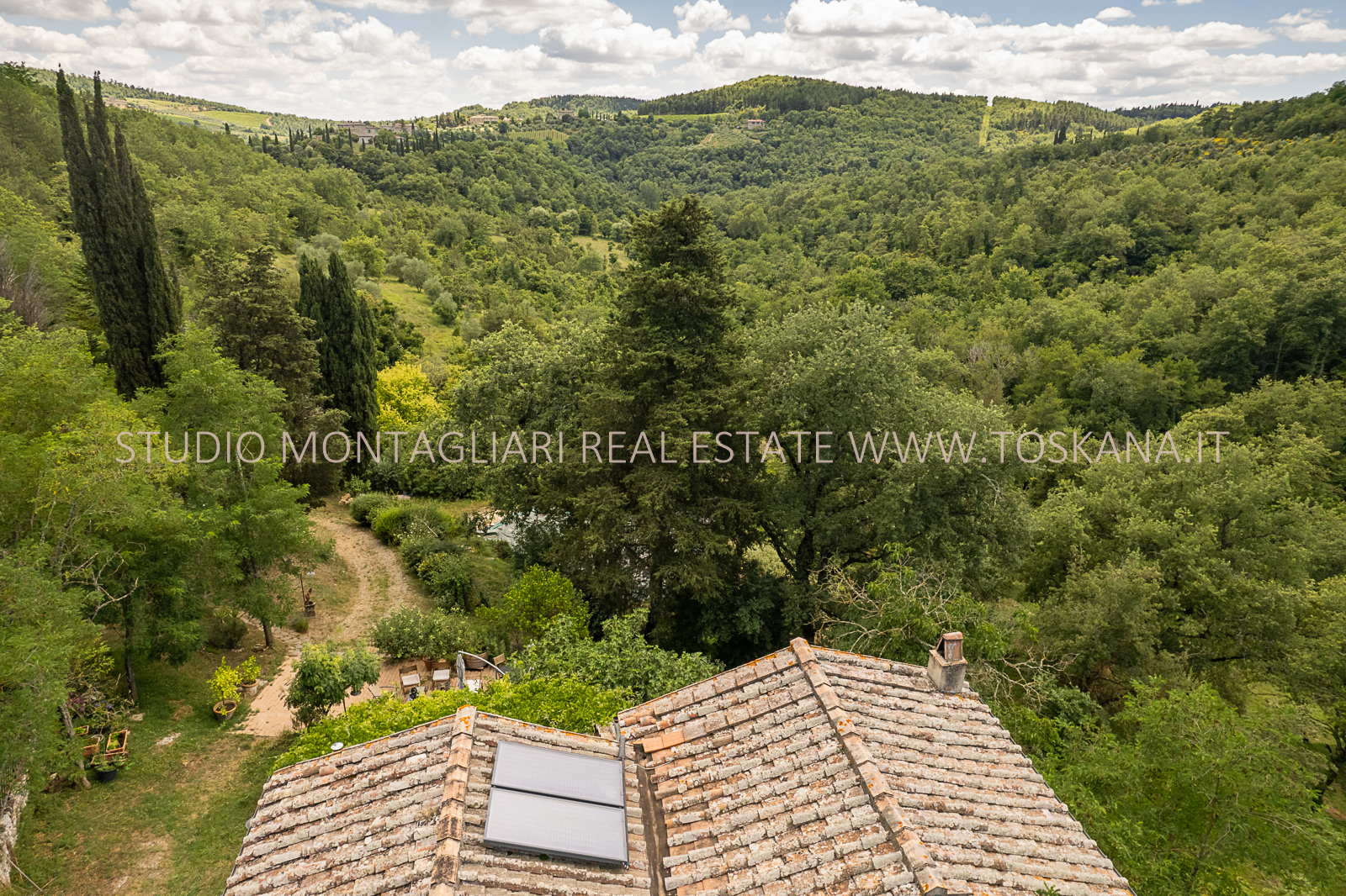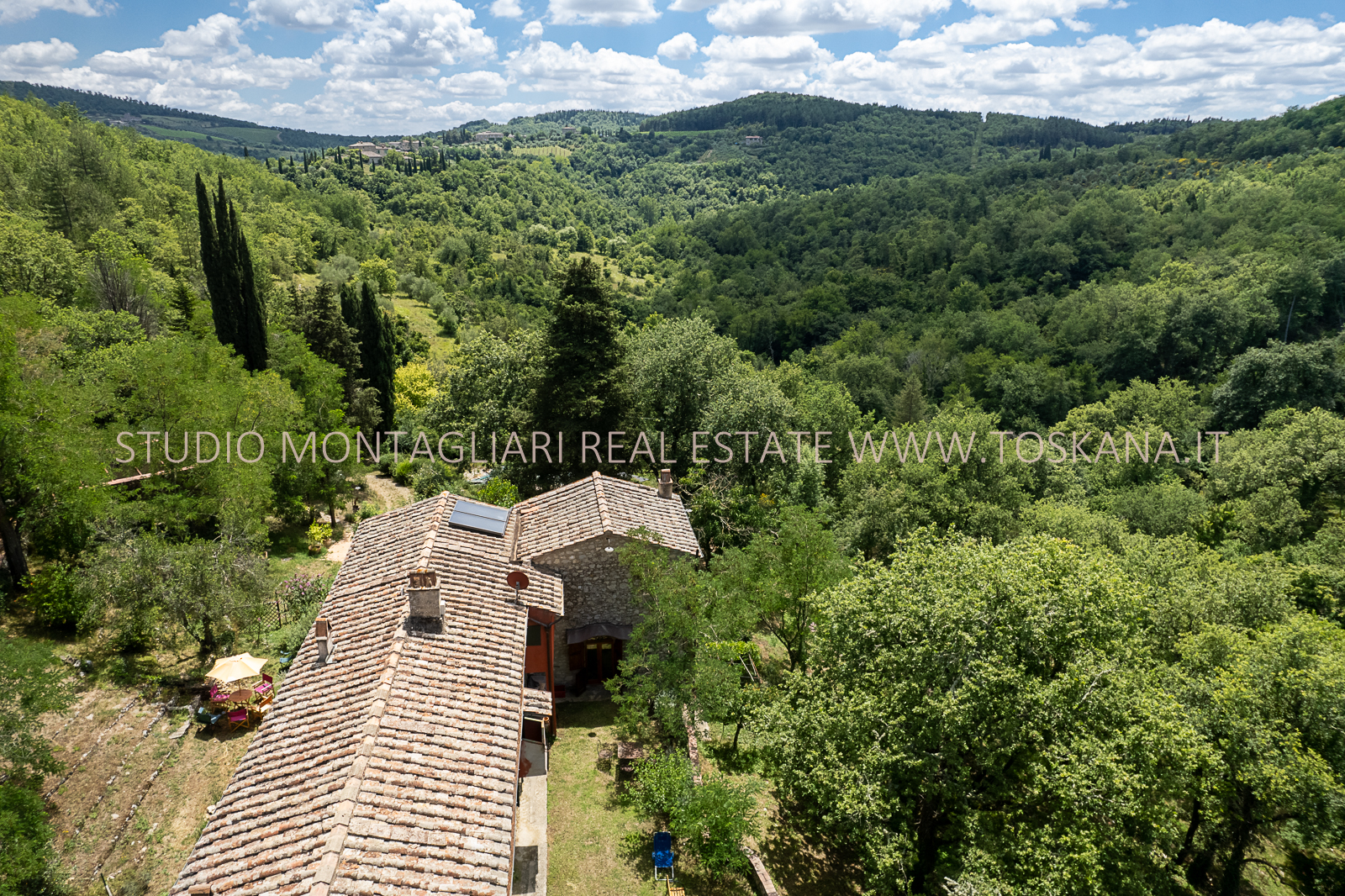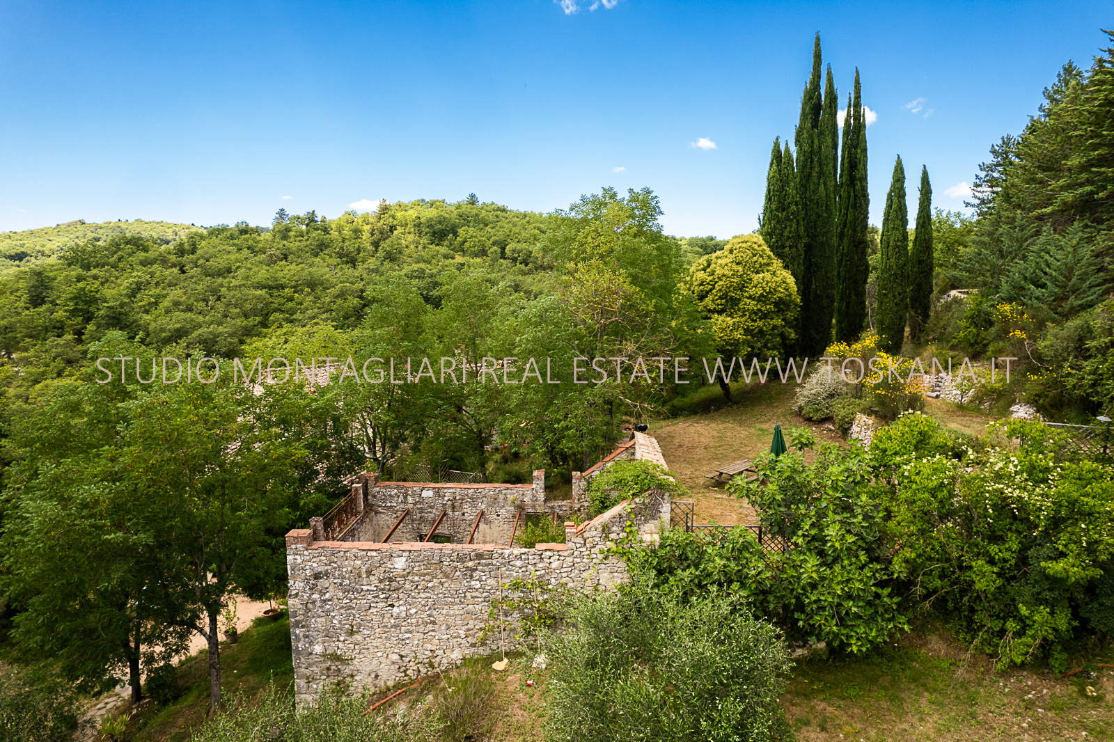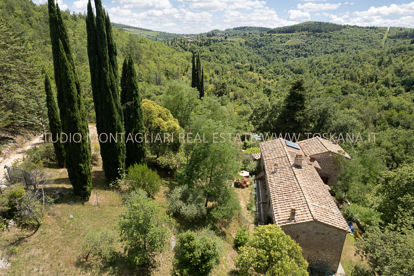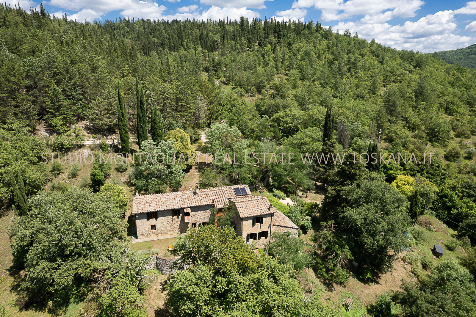 Nel cuore del Chianti Classico, tra Radda e Castellina, immerso in un luogo incantato fatto di boschi e accompagnato dal dolce suono di un ruscello, si trova questo tipico casale toscano con annesso e 3,5 ettari di terreno.