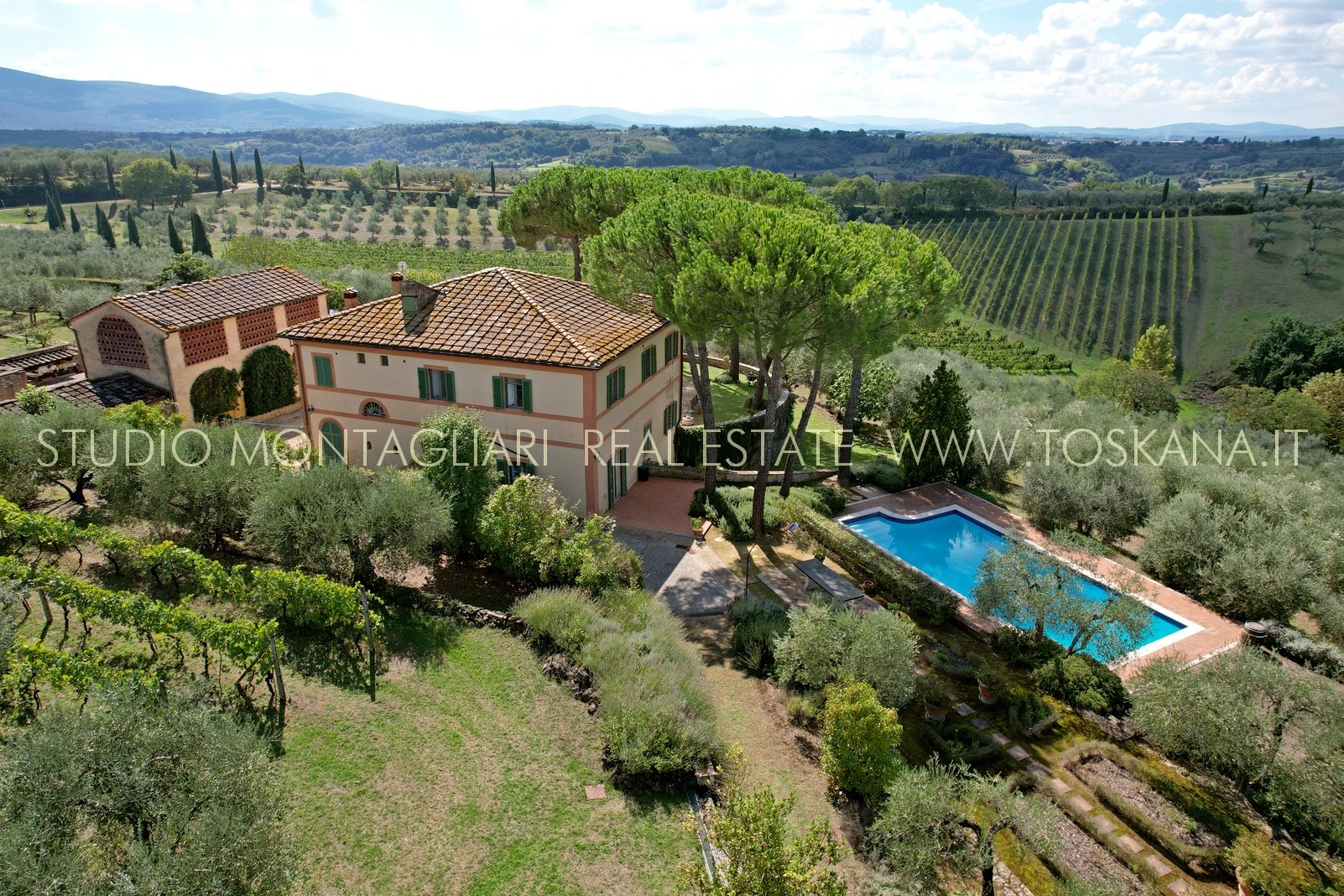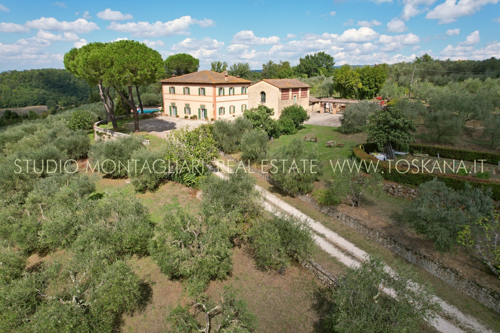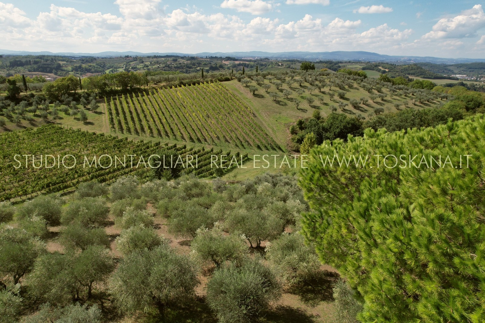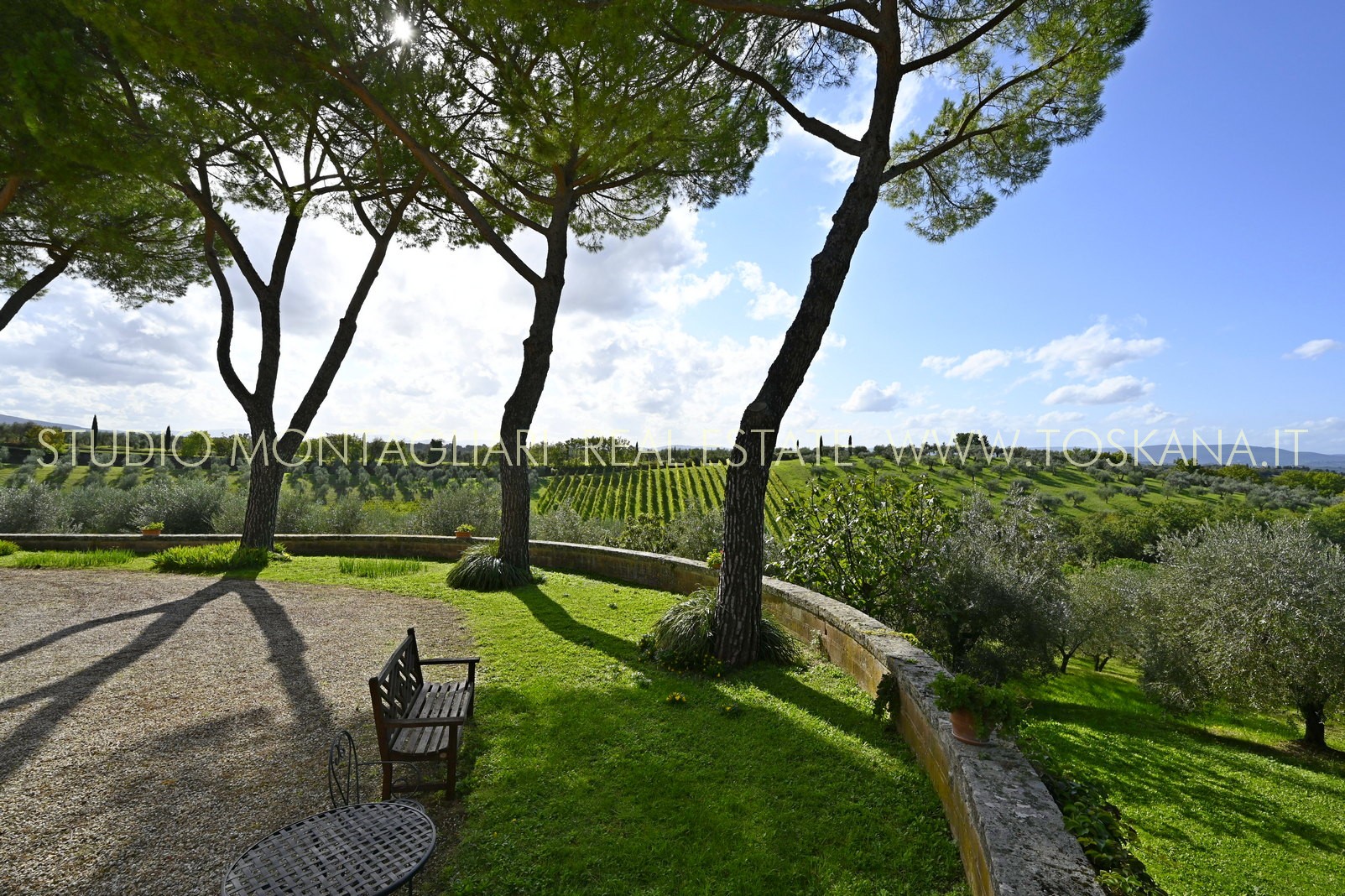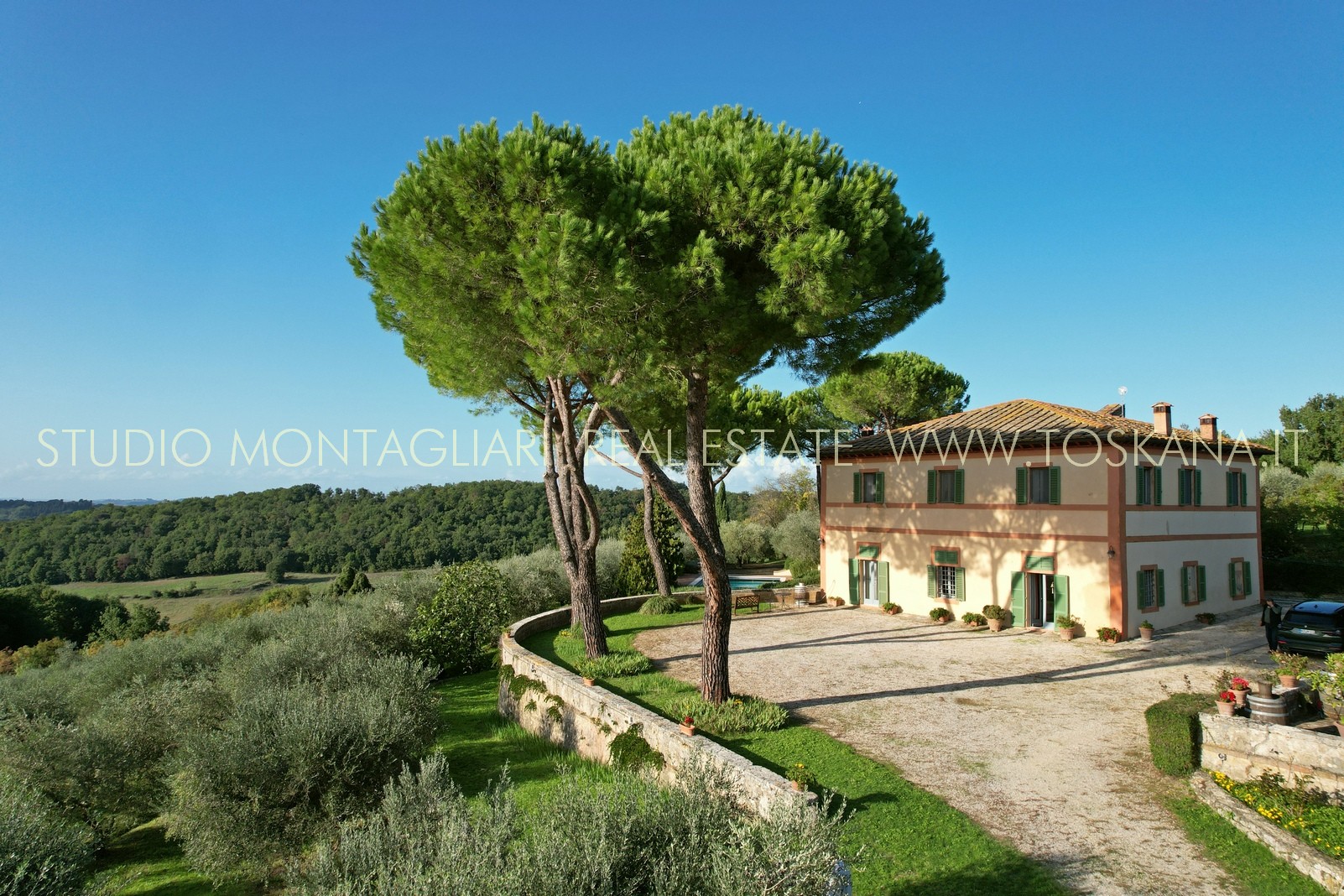 Eleganza e semplicità distinguono questo podere. Dalla proprietà si gode di una fantastica vista sulle dolci colline ricoperte di uliveti e vigneti. È possibile vedere le torri di San Gimignano, la Manhattan del Medioevo, oggi patrimonio mondiale dell'UNESCO.Si arriva in un ampio cortile rialzato e bordato da alti pini mediterranei.
