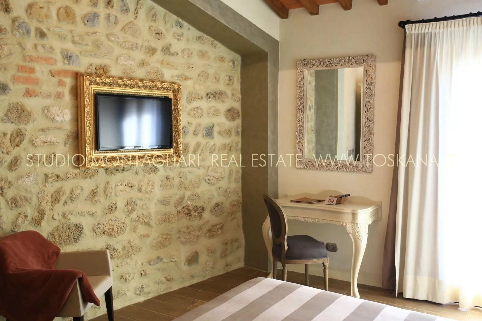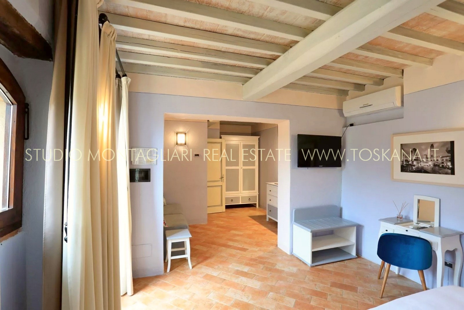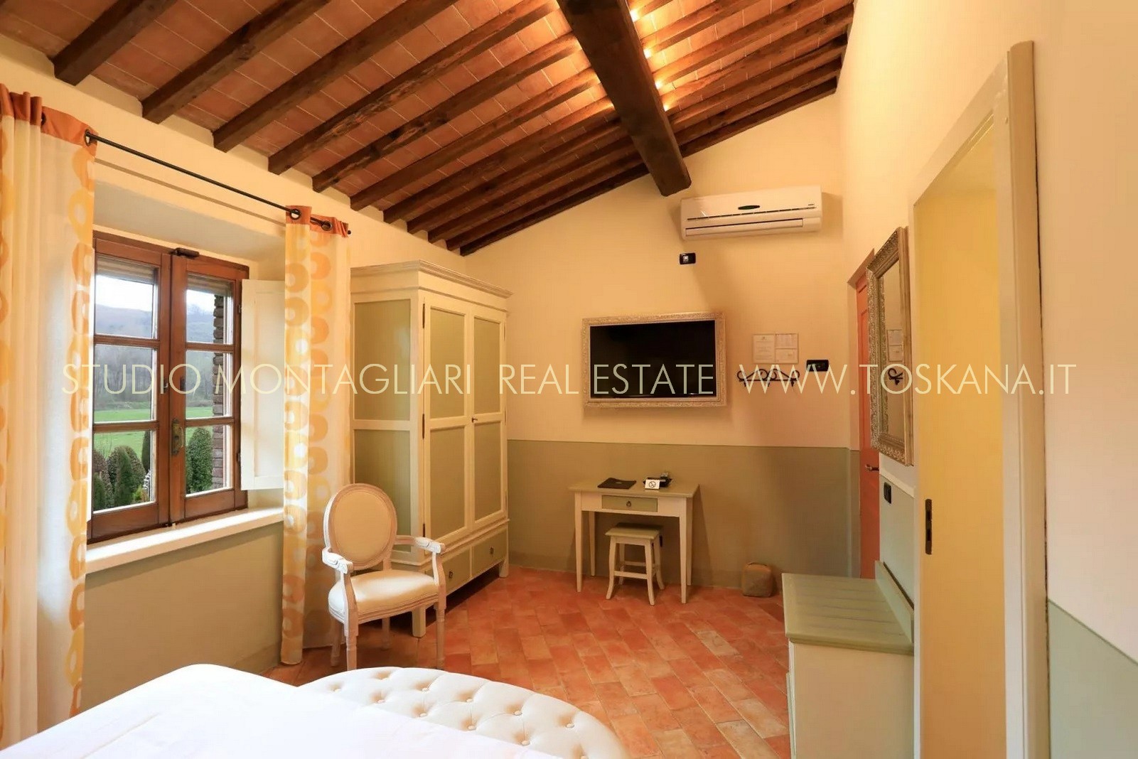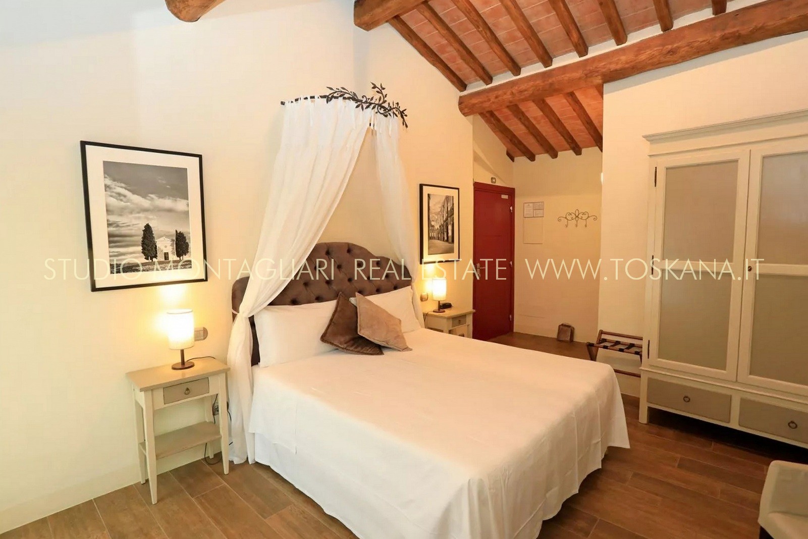 La superficie abitabile di circa 650 mq si sviluppa su tre livelli. L’hotel dispone di 16 camere e di 19 bagni. Ogni ambiente combina stile e comfort pratico, riflettendo l'eredità dell'edificio attraverso elementi quali travi in legno a vista, pavimenti in cotto e viste panoramiche sull'idilliaco paesaggio toscano. La veranda per la colazione con ampie vetrate permette agli ospiti di godere della vista sul verde curato e sulla piscina durante i pasti. La proprietà dispone inoltre di una cucina professionale, un' area lounge e un ufficio reception, garantendo al visitatore un'ospitalità impeccabile.
